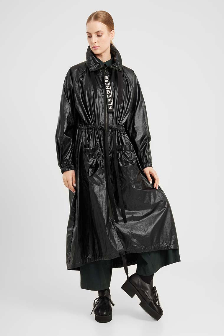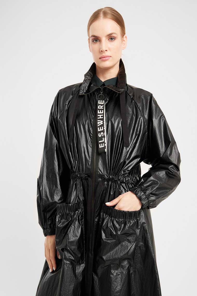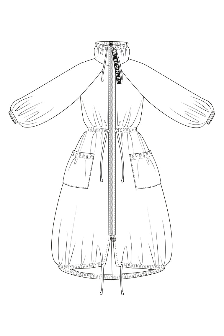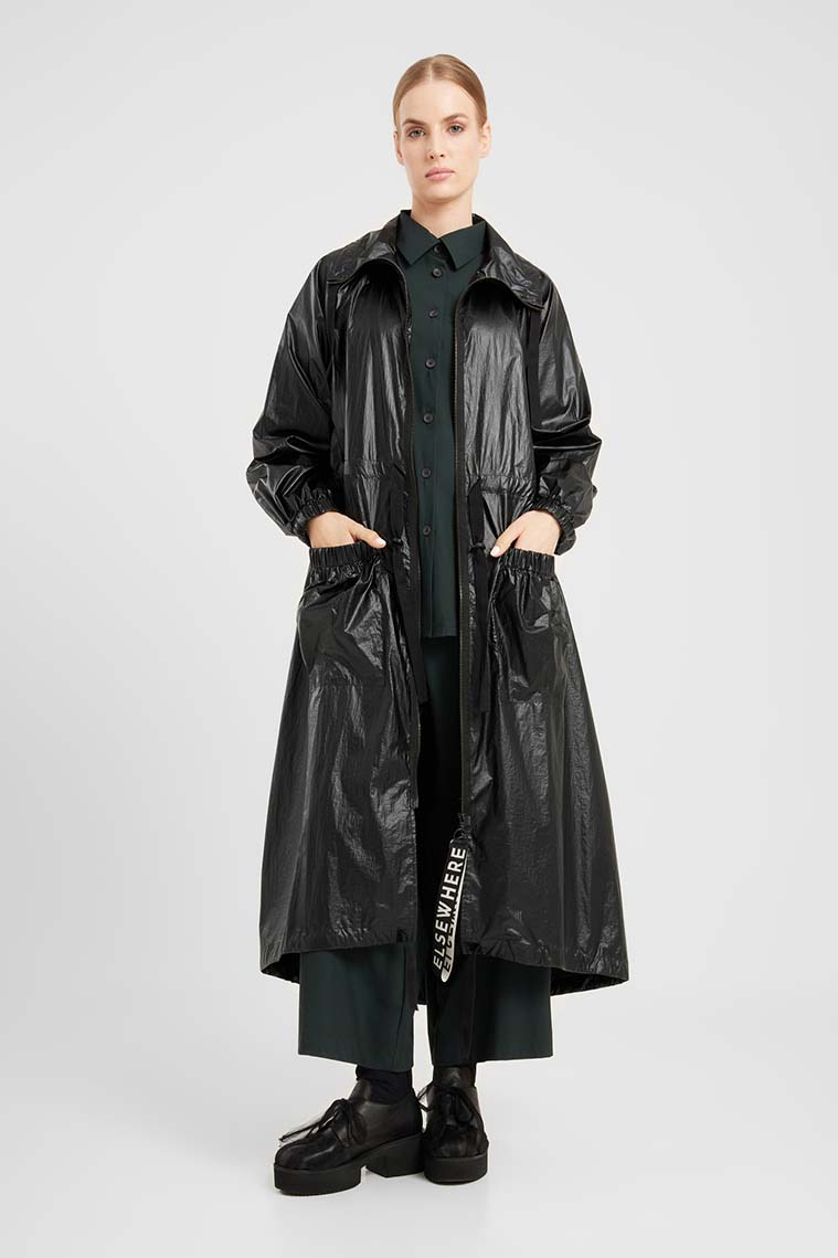 Mantel RAIN aus der Bekleidungskollektion von ELSEWHERE Fashion. Langer Mantel mit großen aufgesetzten Taschen. Der Mantel hat Kordelzüge im Kragen, in der Taille und im Saum. Durch den Zwei-Wege-Reißverschluss kannst du bequem mit dem Mantel Fahrrad fahren.