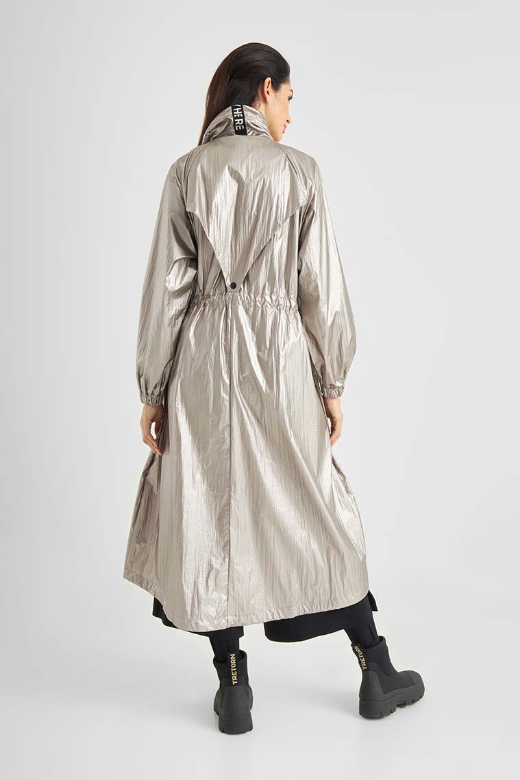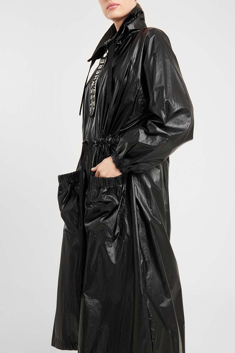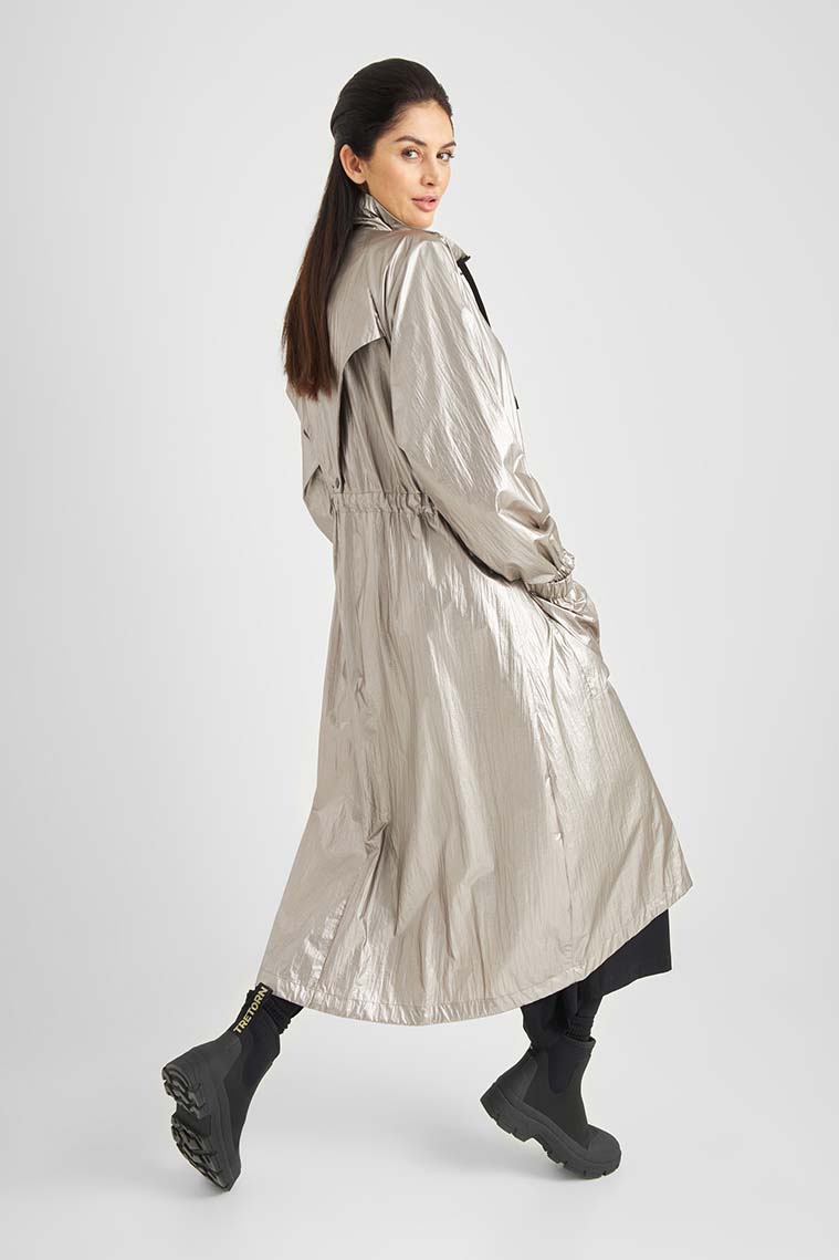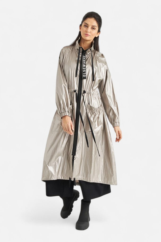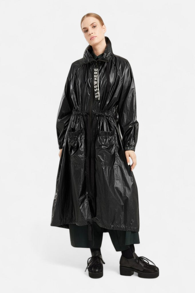 Mantel RAIN aus der Bekleidungskollektion von ELSEWHERE Fashion. Langer Mantel mit großen aufgesetzten Taschen. Der Mantel hat Kordelzüge im Kragen, in der Taille und im Saum. Durch den Zwei-Wege-Reißverschluss kannst du bequem mit dem Mantel Fahrrad fahren.