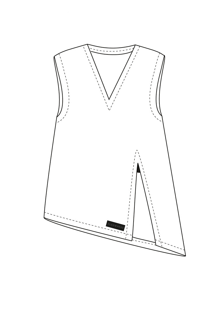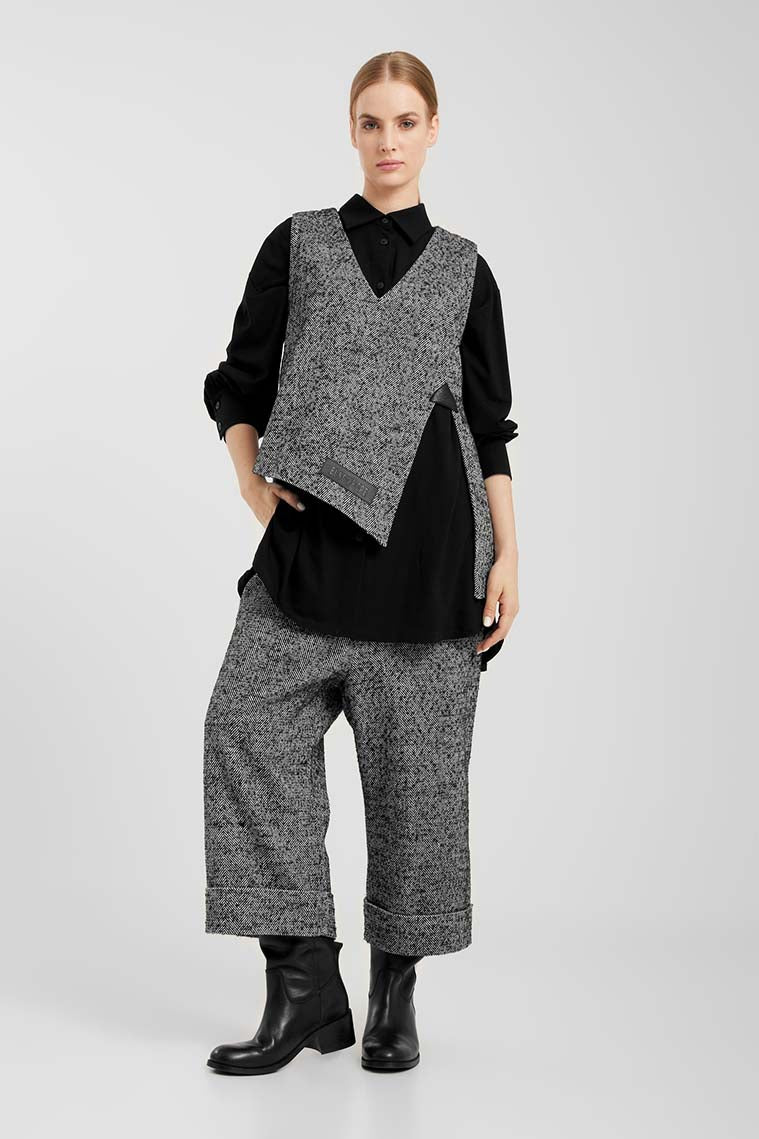Spencer HERBO aus der Bekleidungskollektion von ELSEWHERE Fashion. Langer Spencer mit V-Ausschnitt und schrägem Saum. Auf der Vorderseite befindet sich ein tiefer und breiter Schlitz mit einem Lederdetail.