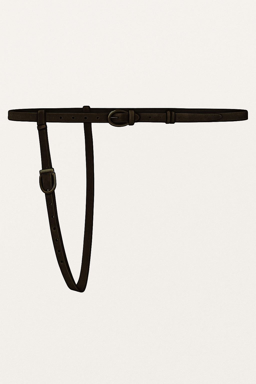 Gürtel RIDE aus der Bekleidungskollektion von ELSEWHERE Fashion. Schmaler Gürtel mit zusätzlichem Band, das sowohl über der Schulter als auch locker hängend getragen werden kann.
