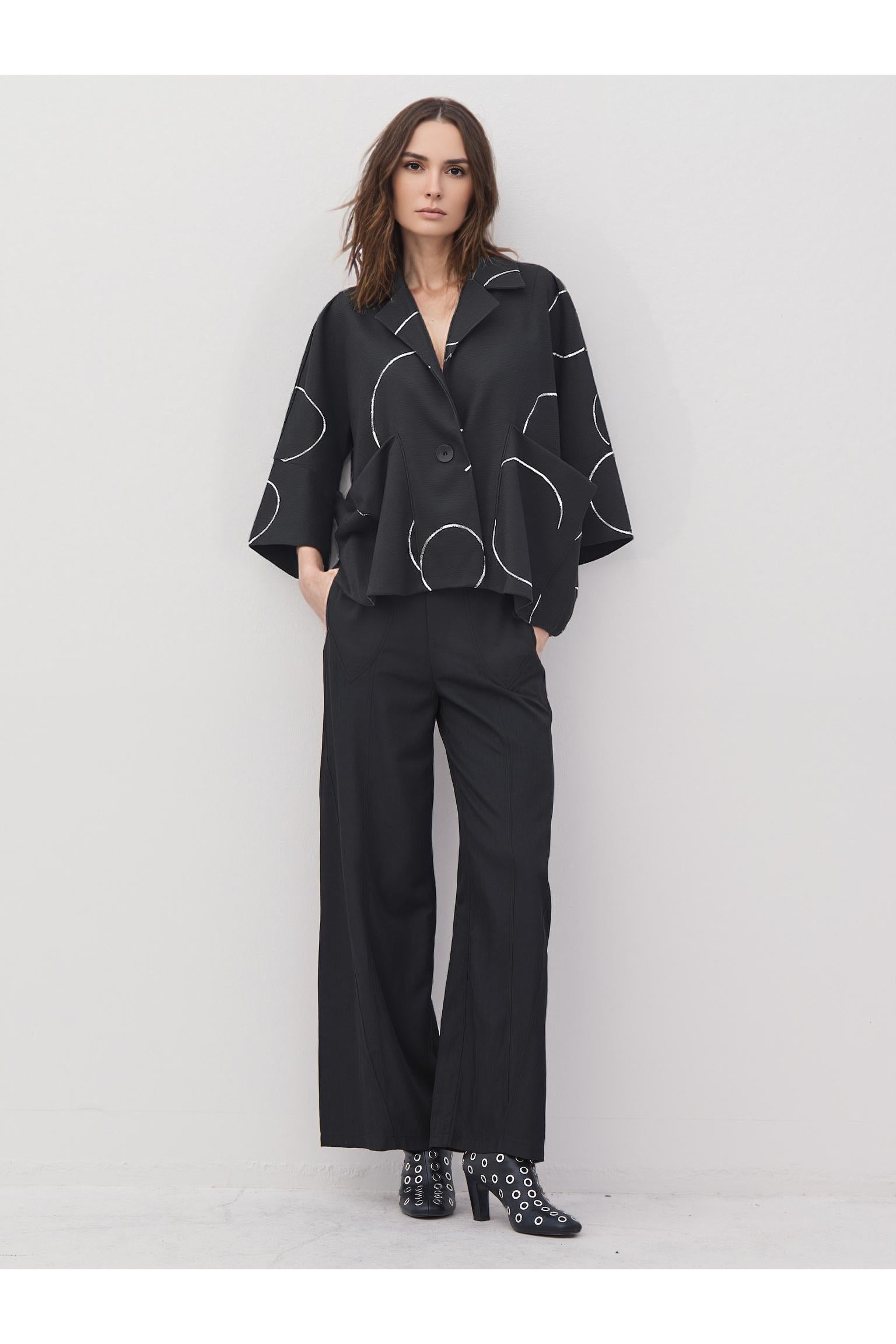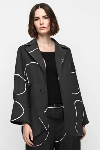 Jacke ELENI aus der Bekleidungskollektion von OZAI N KÜ. Super oversized Modelljacke mit Revers und Ein-Knopf-Verschluss. Die Jacke hat zwei aufgesetzte Taschen.