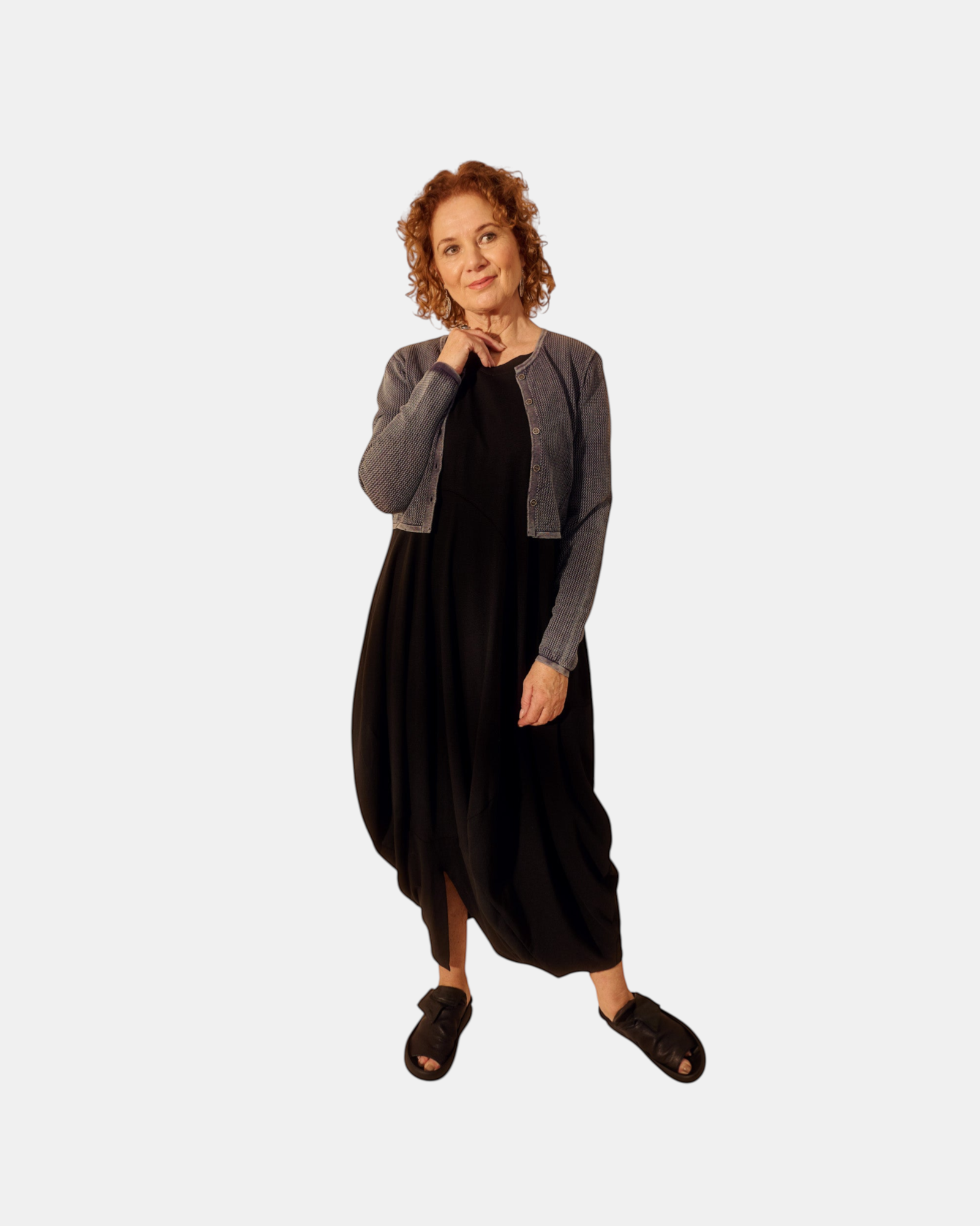 Kleid COTO aus der Bekleidungskollektion von URBAN by Alembika. Tulpenförmiges Kleid mit asymmetrischen Teilungsnähten.