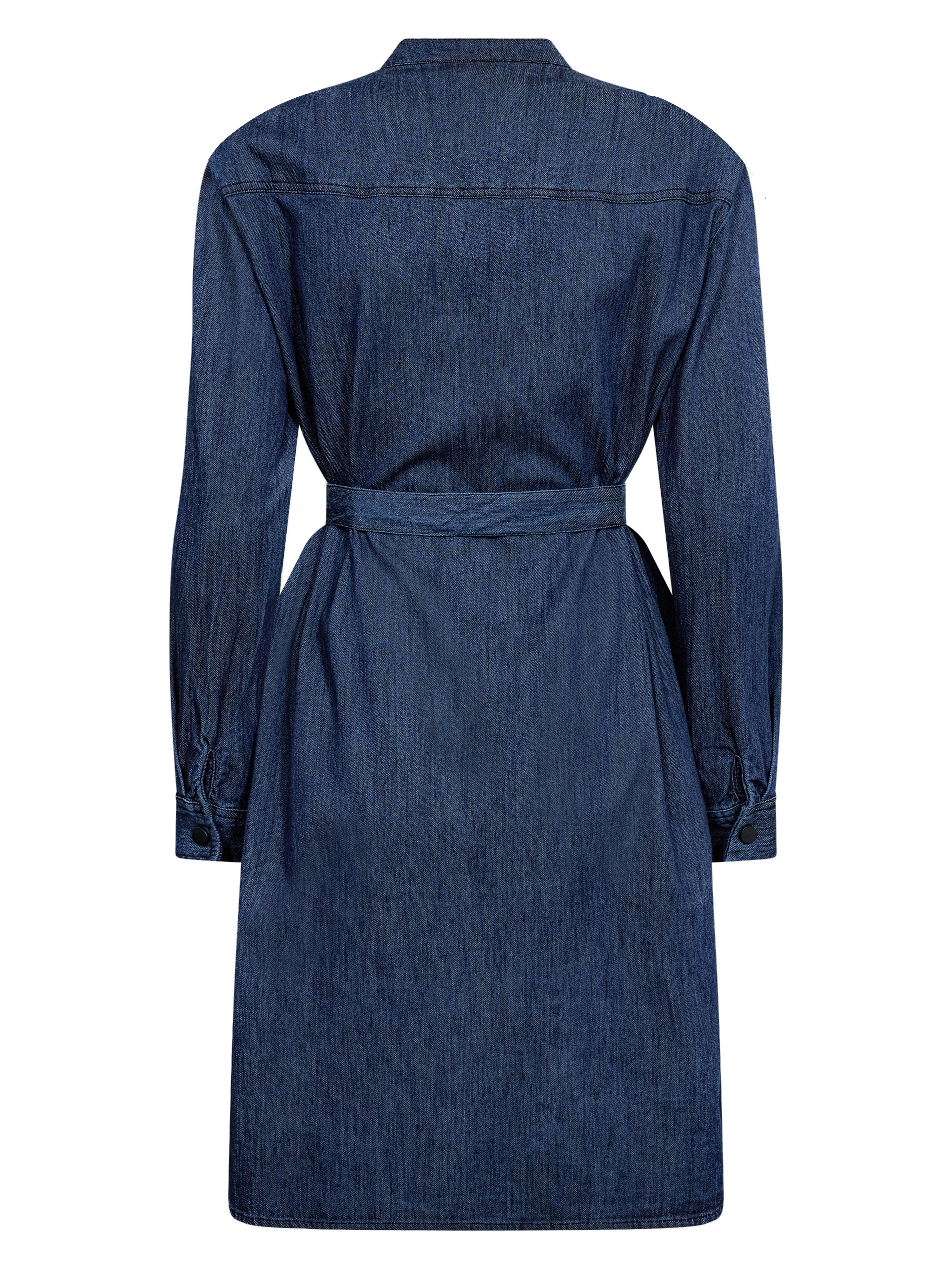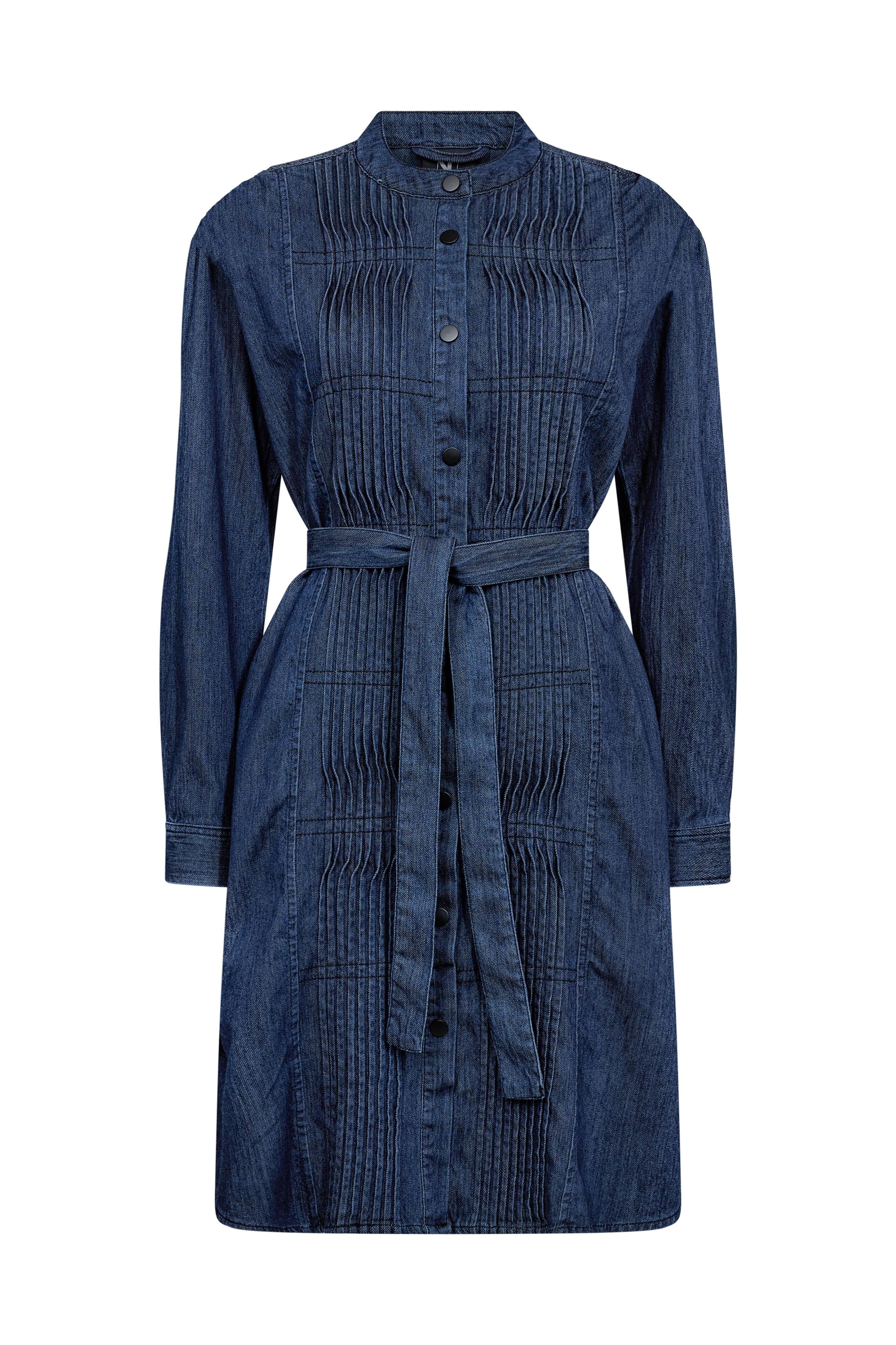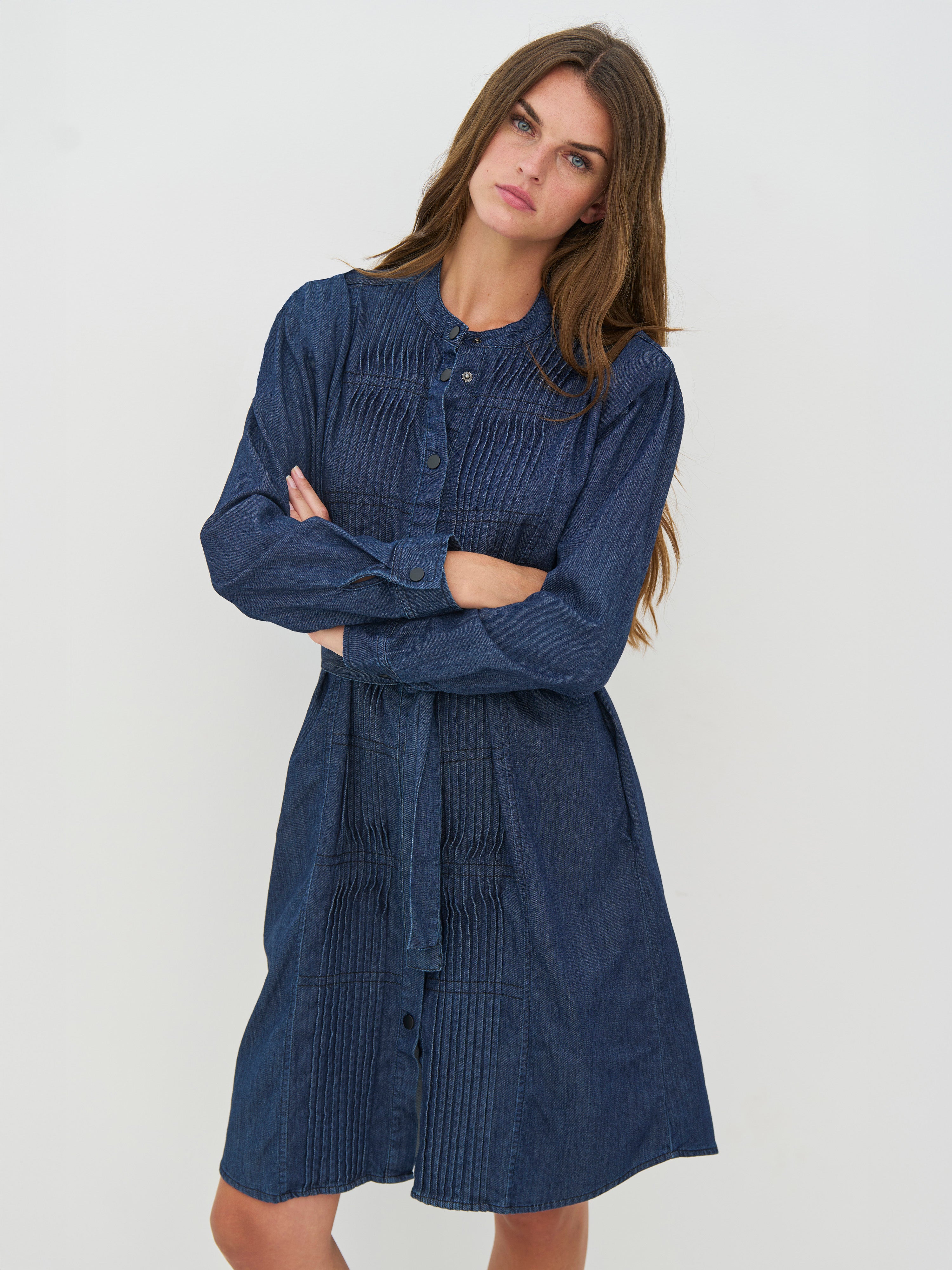 Kleid CARLENE aus der Bekleidungskollektion von NÜ DENMARK. Durchgeknöpftes Modell mit stilvollen Falten-Details und einem Knoten-Gürtel. Auch schön als langer Blazer über einer Hose zu tragen.