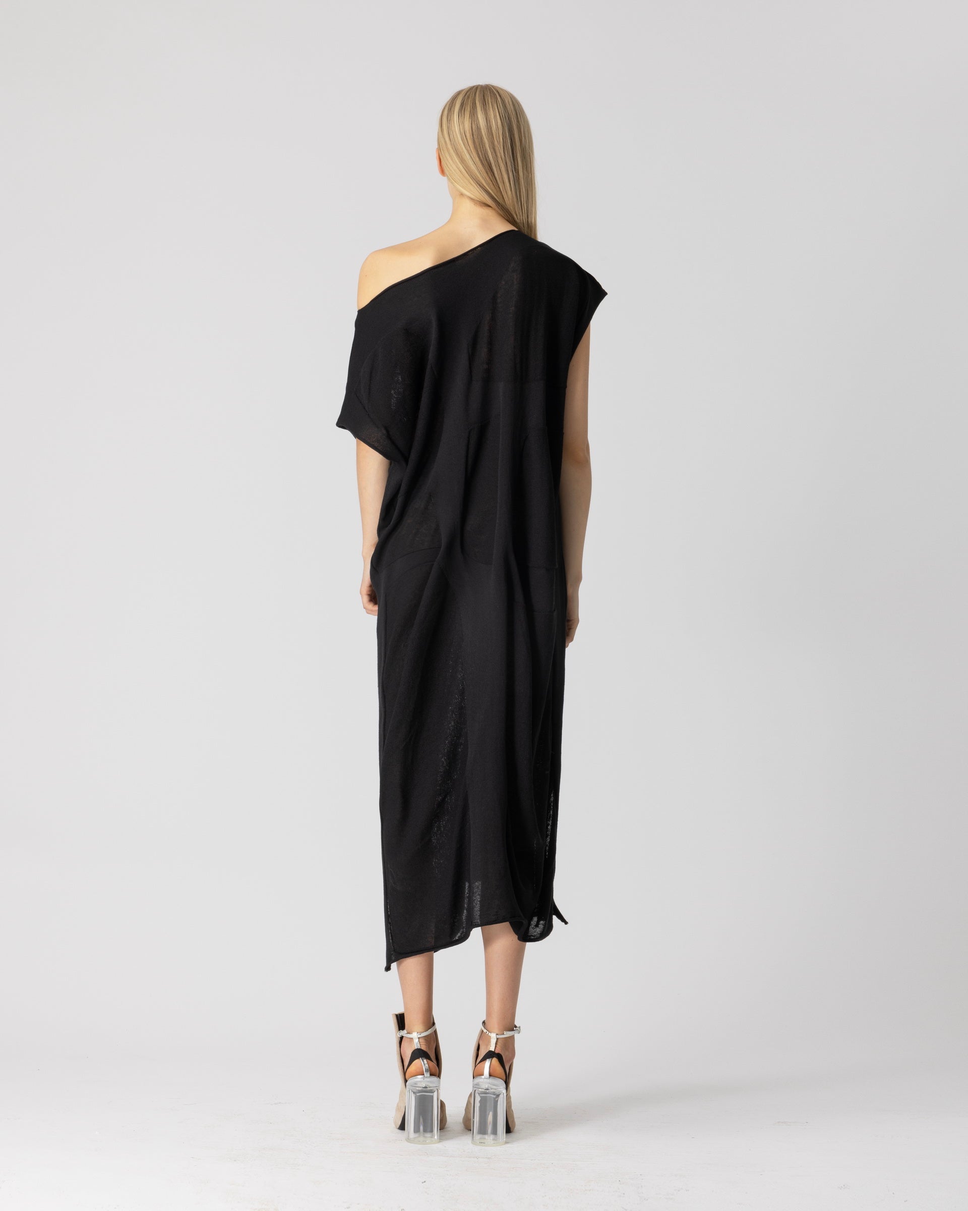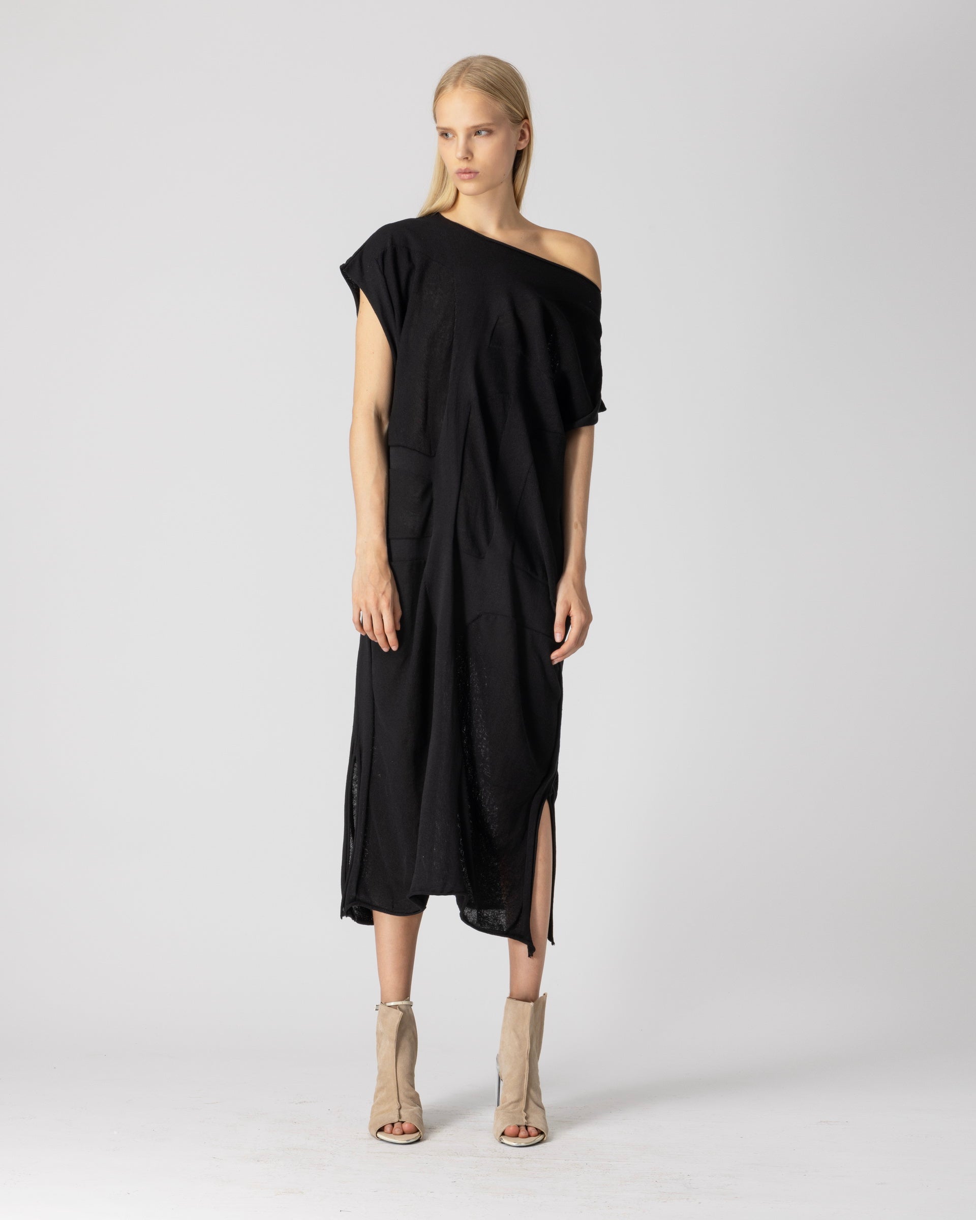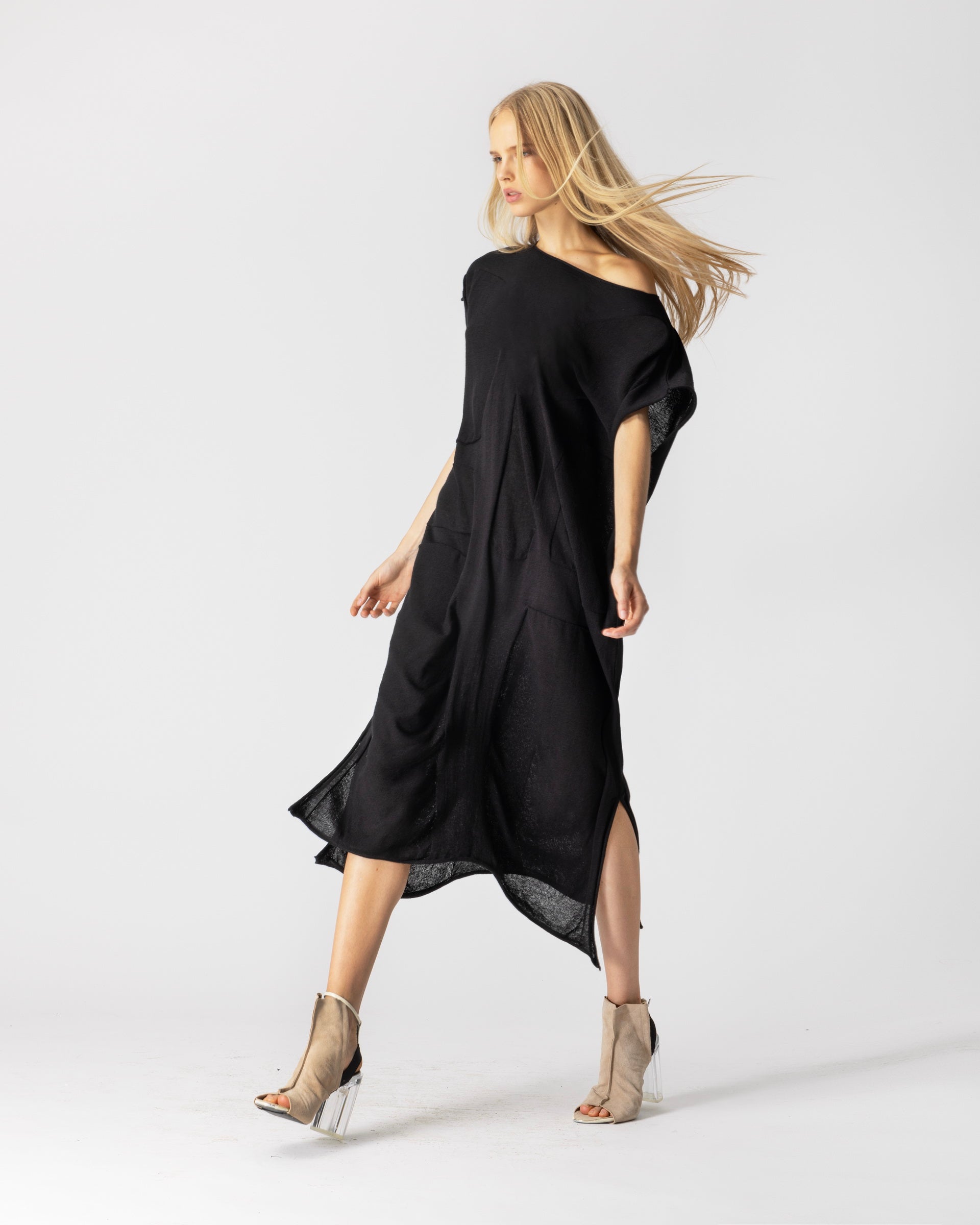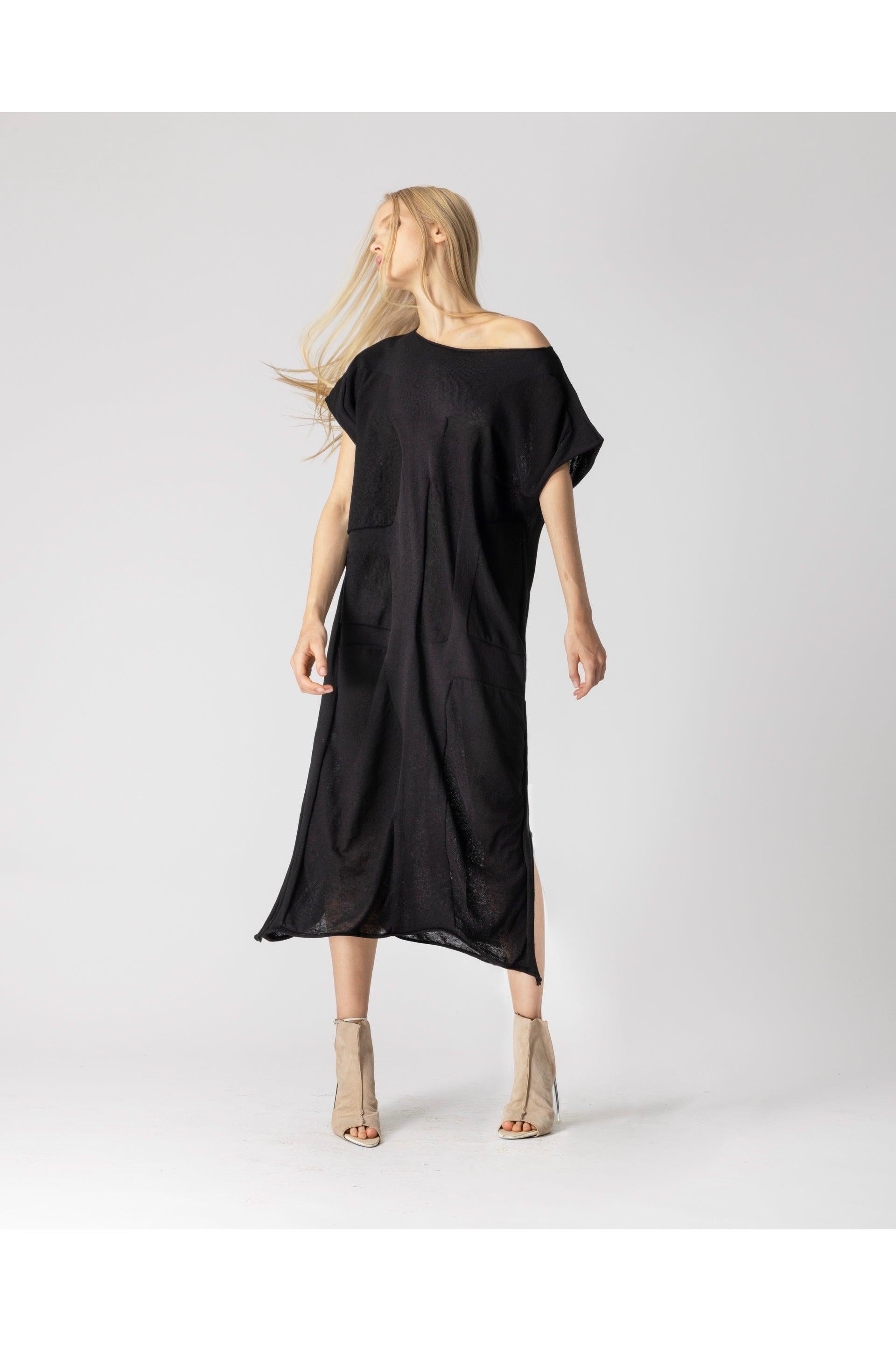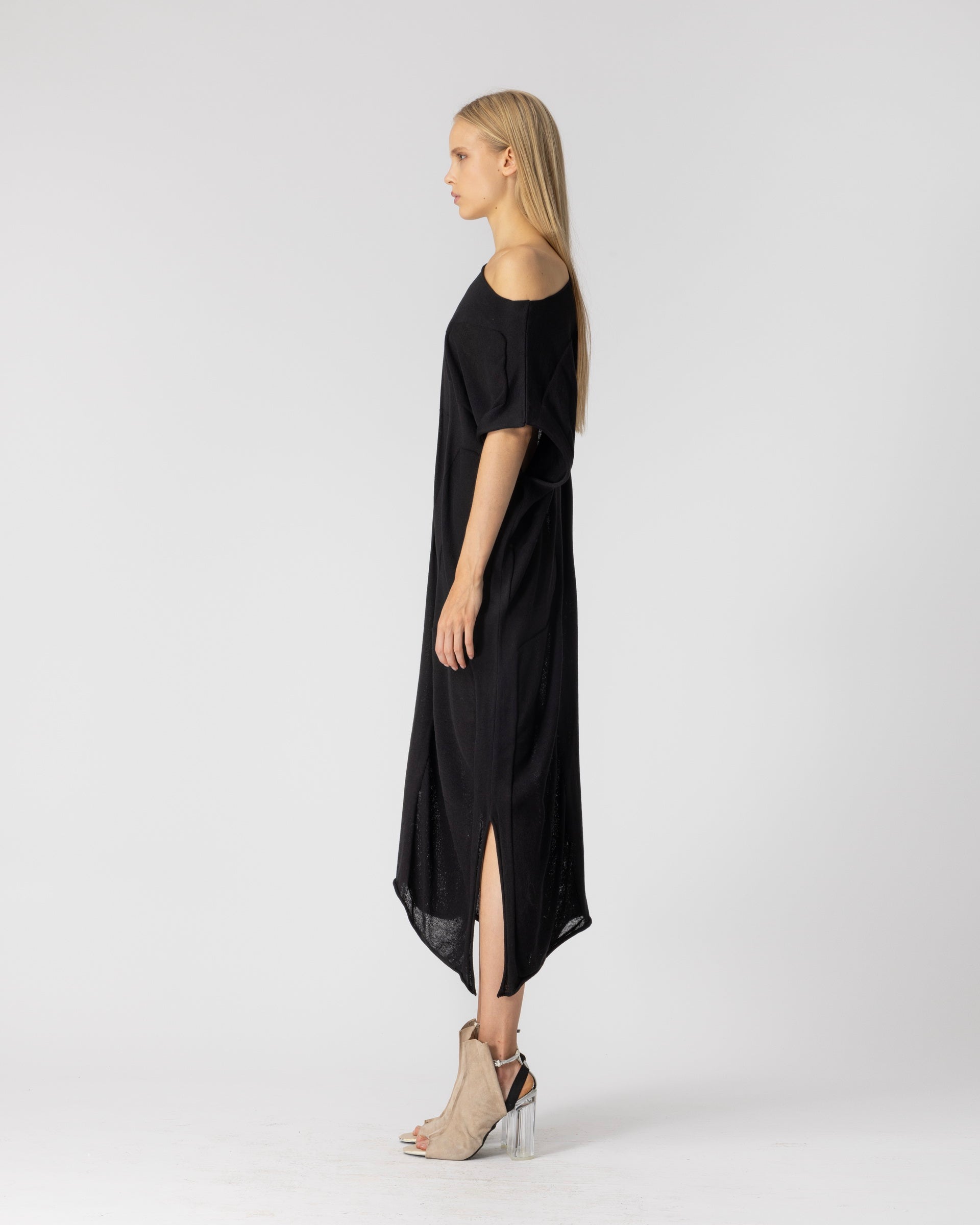 Kleid ERAN aus der Bekleidungskollektion von LOTUS EATERS. Langes, gerade geschnittenes Kleid mit Rundhalsausschnitt und kurzen Ärmeln.