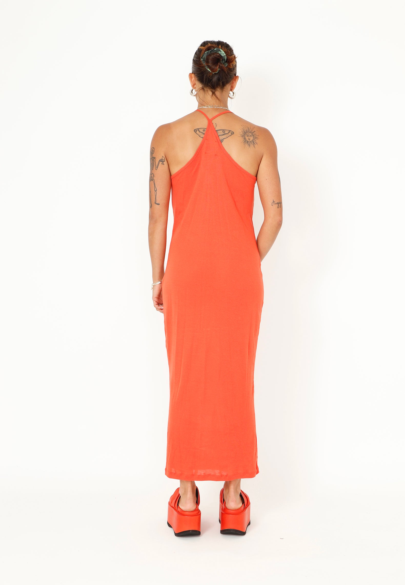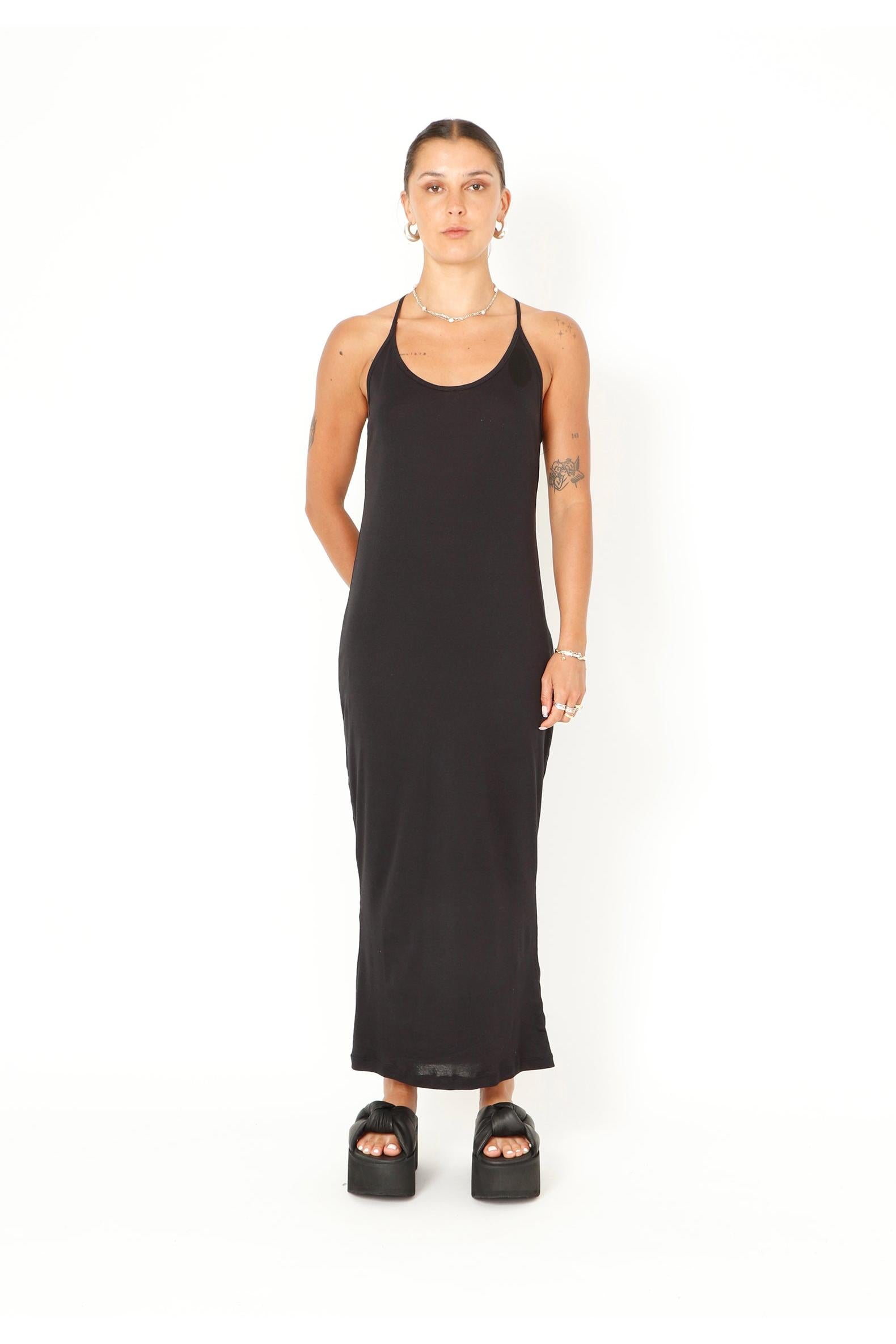 Kleid BARLIA aus der Kleidungskollektion von Sort Aarhus. Sommerkleid mit Spaghettiträgern und halterähnlichem Rückenausschnitt. Schön kombinierbar mit dem transparenten Top oder Kleid von Sort Aarhus.= für einen geschichteten Look.