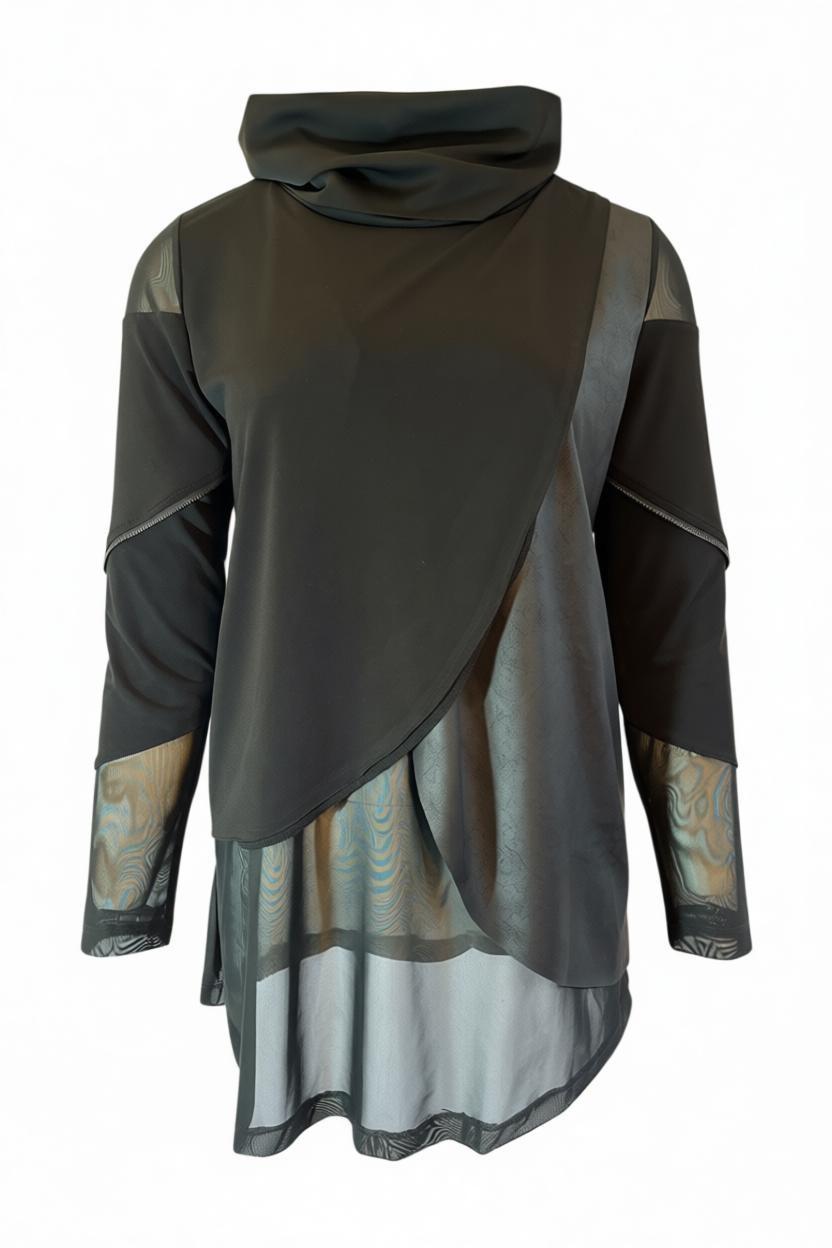 Top ZORA aus der Bekleidungskollektion von NILMARK. Ein eigenwilliger Top aus verschiedenen Materialien, die im Vorderteil locker übereinander fallen. Der Top hat einen locker fallenden, dünnen Rollkragen und Felsendetails an den Ärmeln.