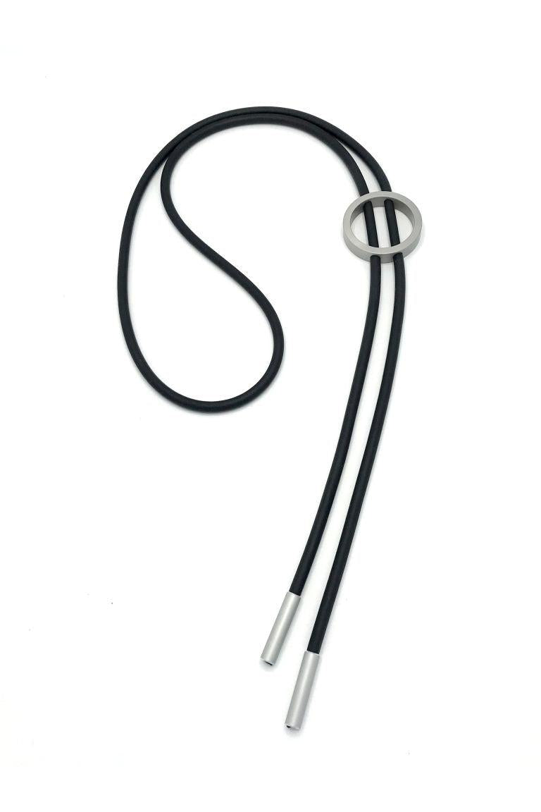 Künstlerische AnZZ-Kette aus Gummi mit einem runden Element aus Aluminium und zwei Aluminium-Elementen an den Enden.