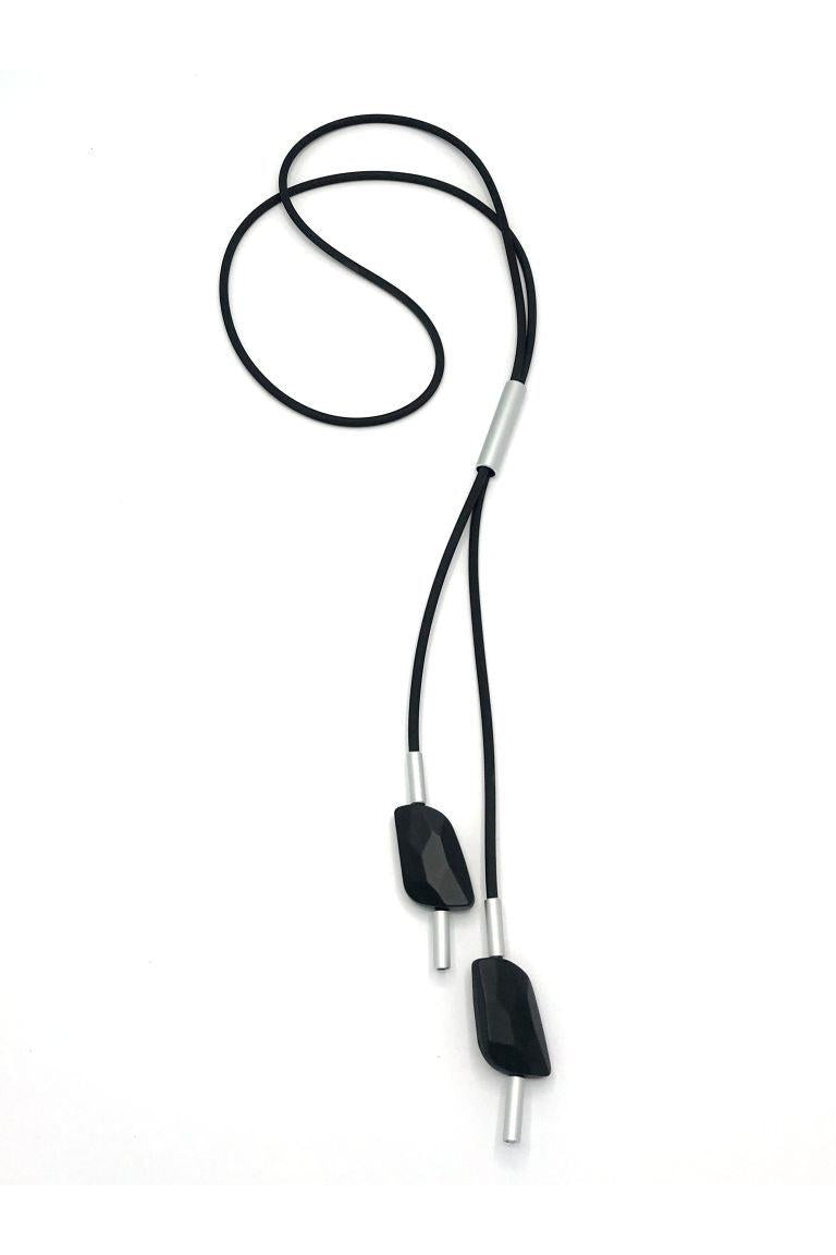 Künstlerische AnZZ-Kette aus Gummi mit einem Element aus Aluminium und zwei schwarzen Aluminium-Elementen an den Enden.