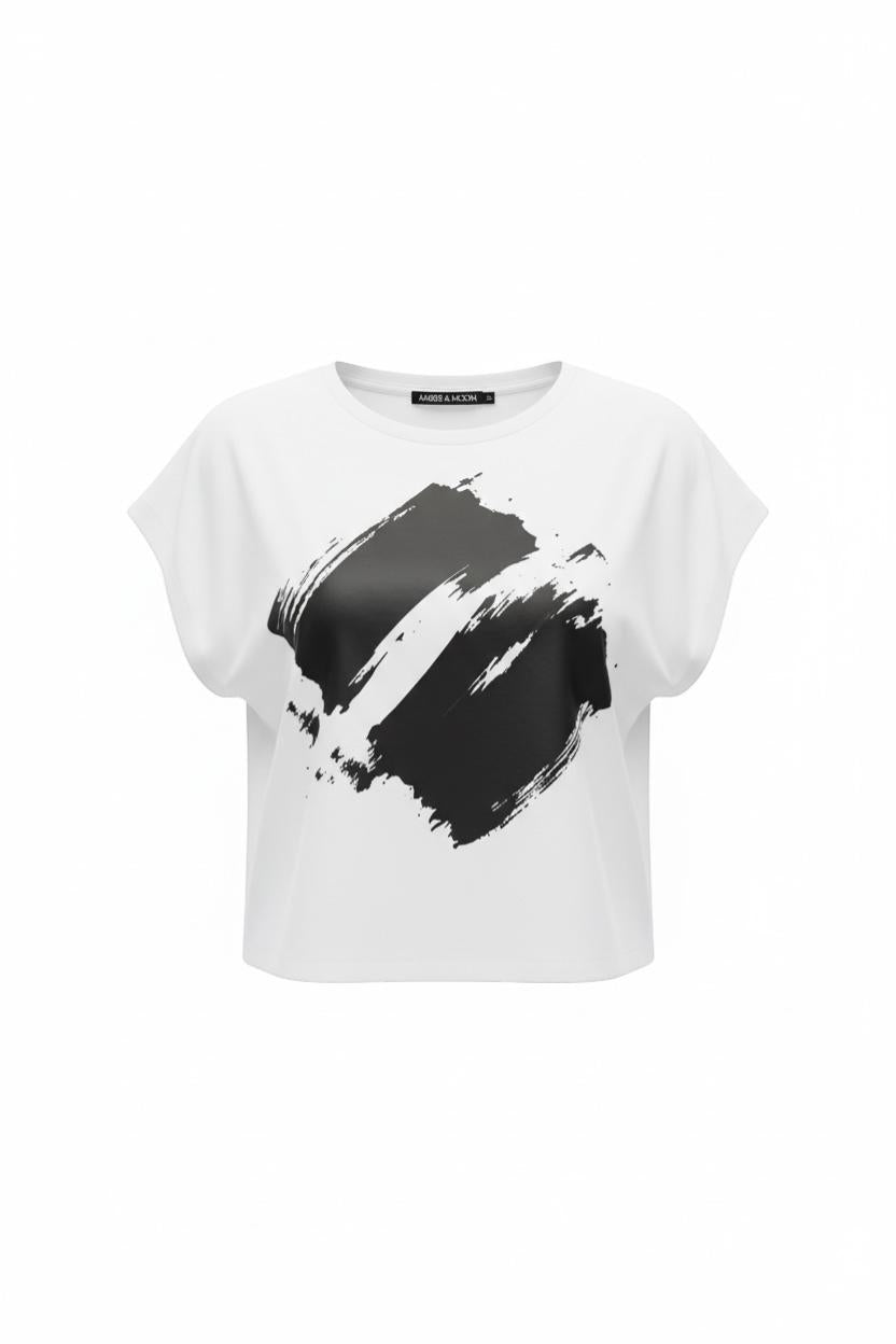 Top CALLE aus der Bekleidungskollektion von AMBER & MOON. Boxy-Top mit rundem Ausschnitt und kurzen Ärmeln.