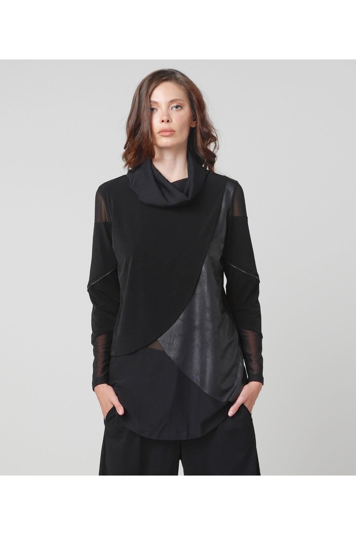 Top ZORA aus der Bekleidungskollektion von NILMARK. Ein eigenwilliger Top aus verschiedenen Materialien, die im Vorderteil locker übereinander fallen. Der Top hat einen locker fallenden, dünnen Rollkragen und Felsendetails an den Ärmeln.