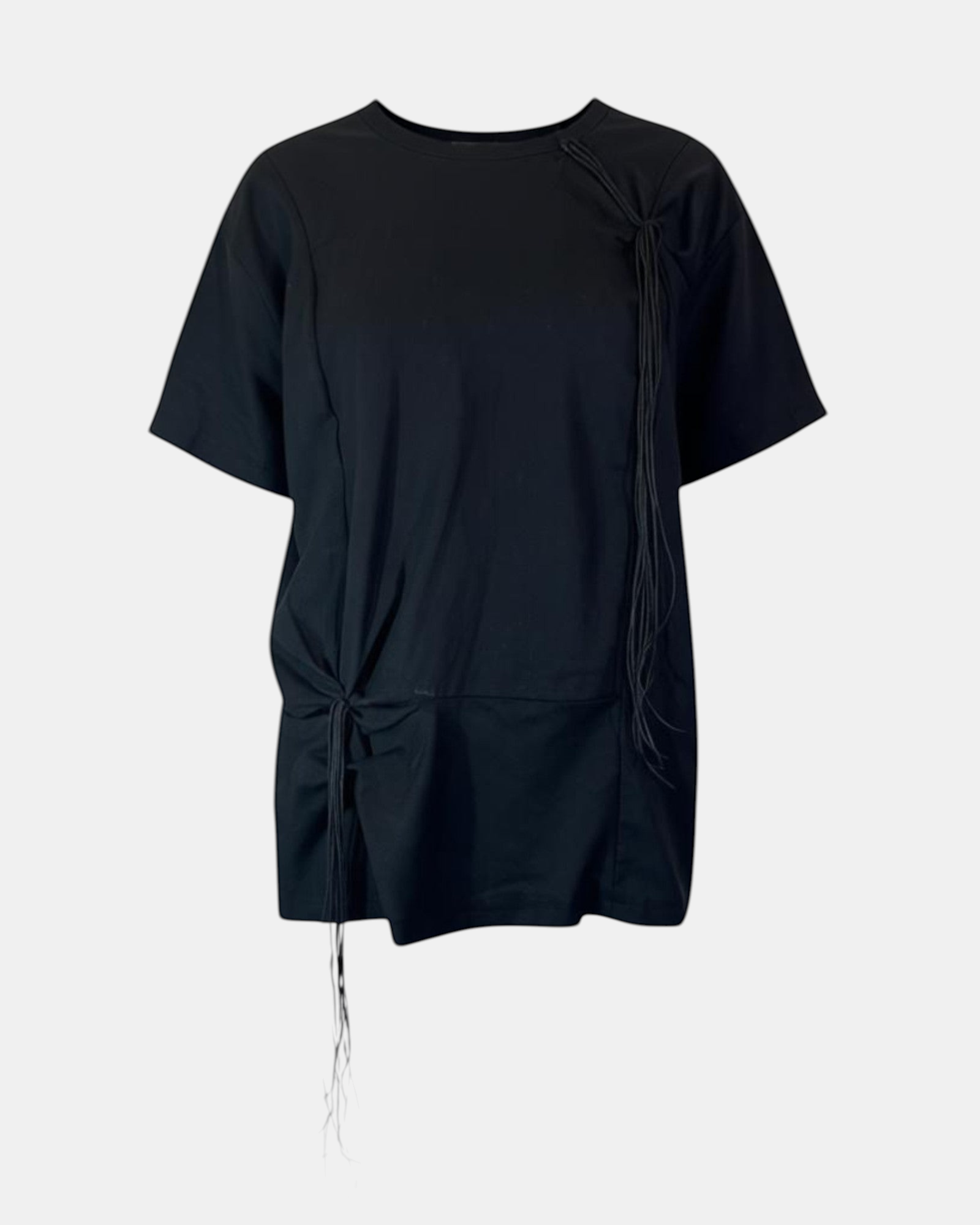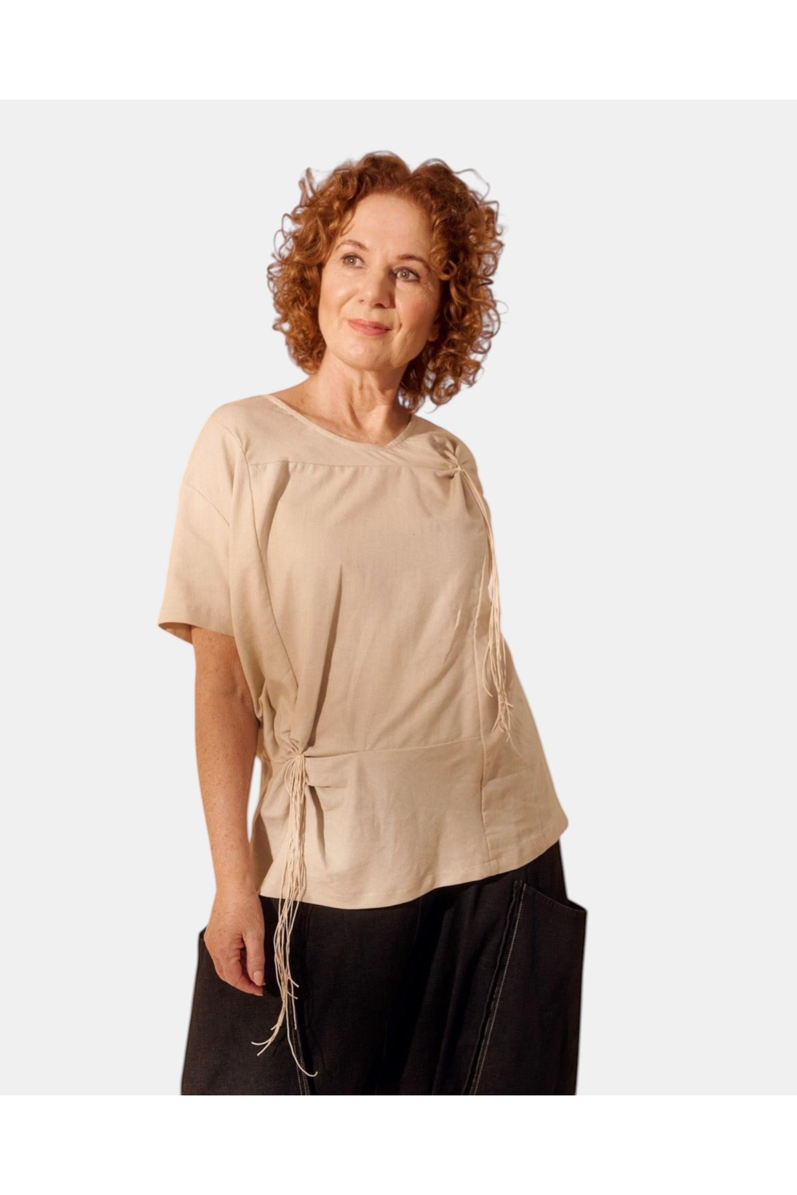 Top BLUSH LUMIERE aus der Bekleidungskollektion von PAPUCEI. Gerades Modell mit Rundhalsausschnitt und kurzen Ärmeln. Auf der Vorderseite hat das Top zwei Kordeldetails.