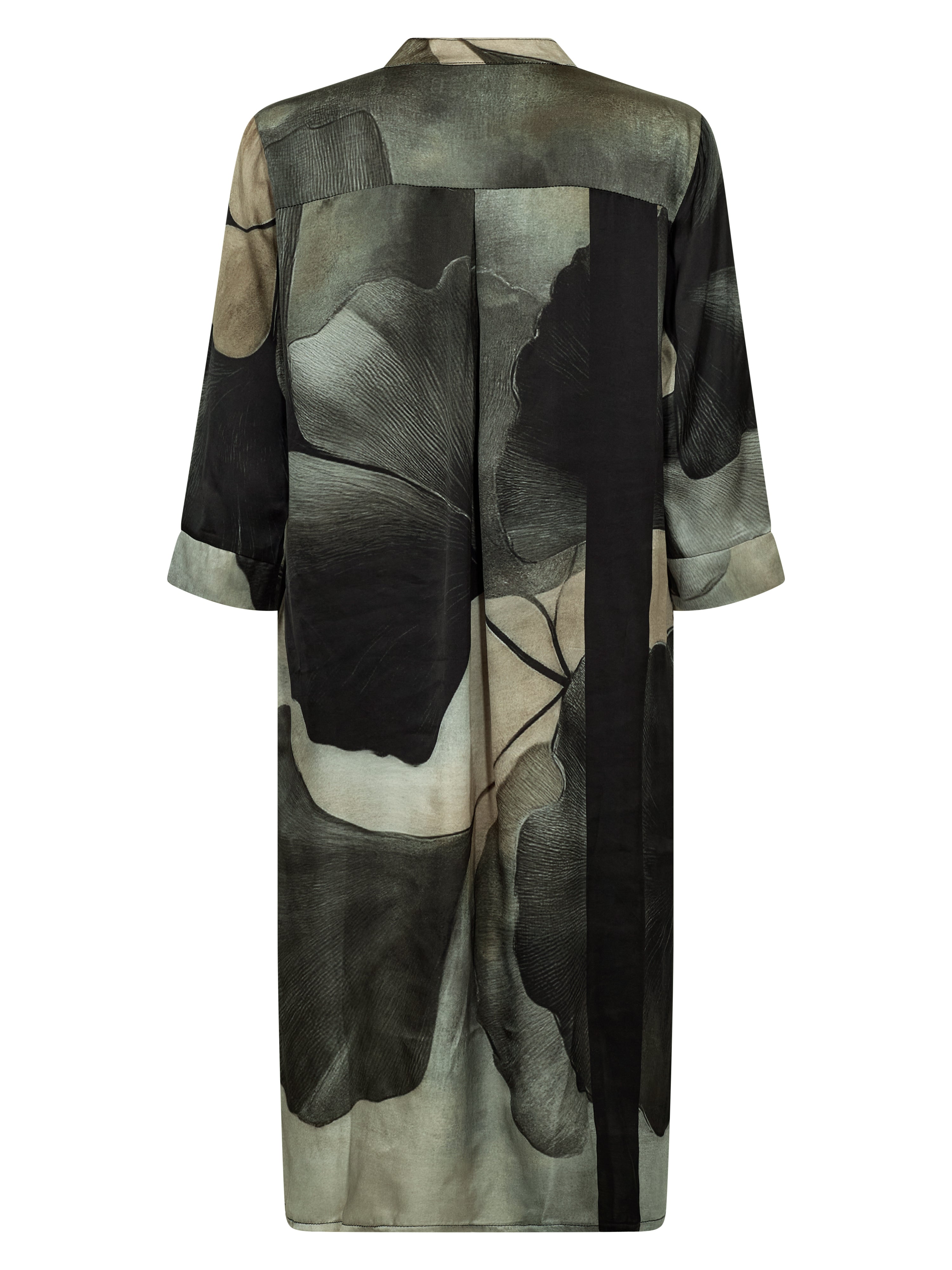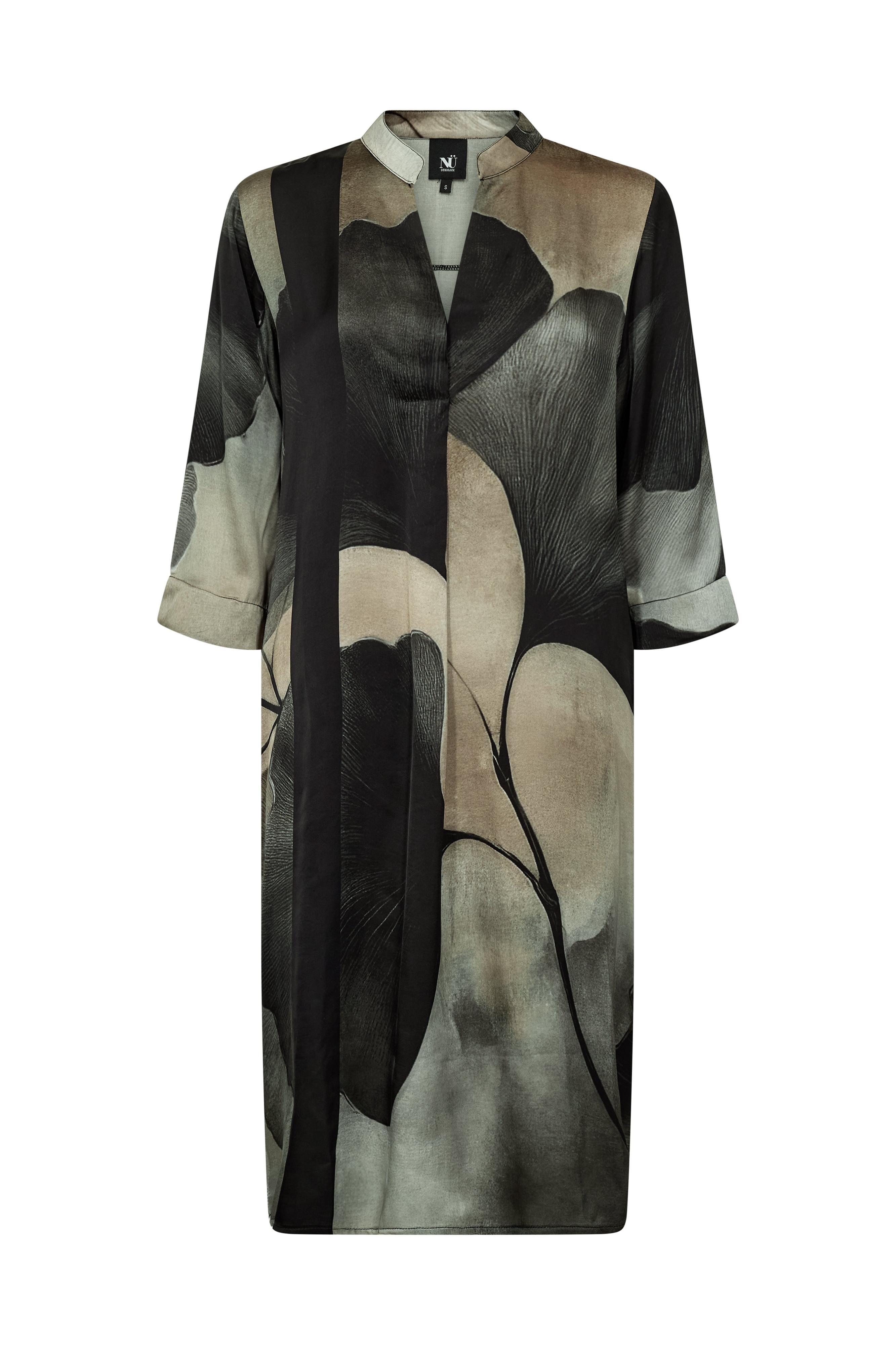 Tunikakleid CILJE aus der Bekleidungskollektion von NÜ DENMARK. Elegantes Tunikakleid mit V-Ausschnitt. Das Kleid hat einen schwarzen Untergrund mit einem grafischen Print in Beige-/Brauntönen. Die 3/4-Ärmel sind mit Manschetten versehen.