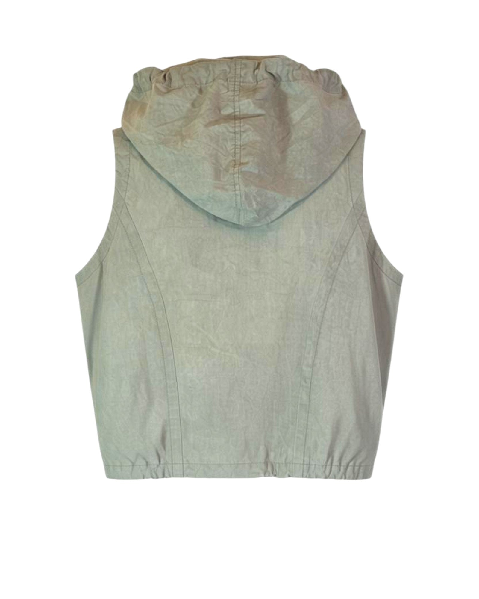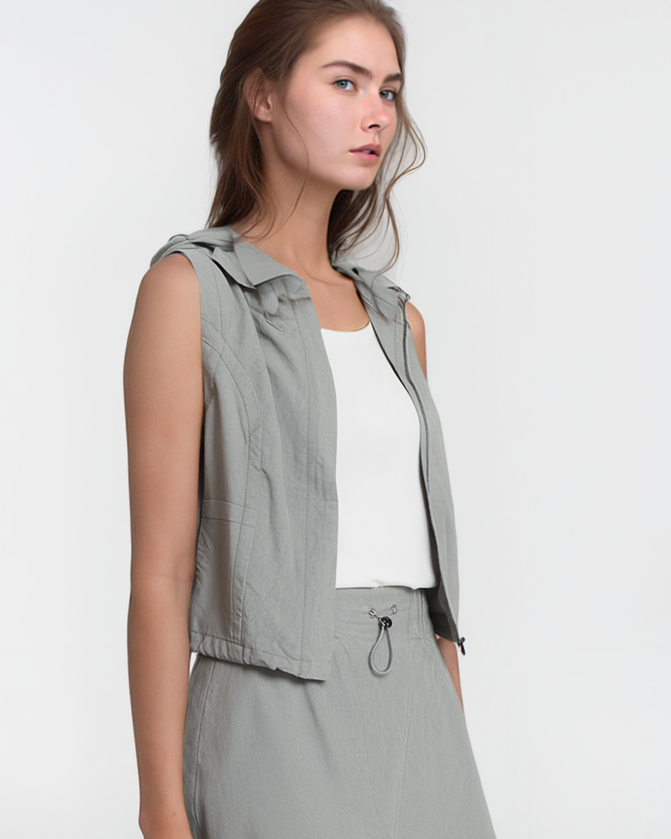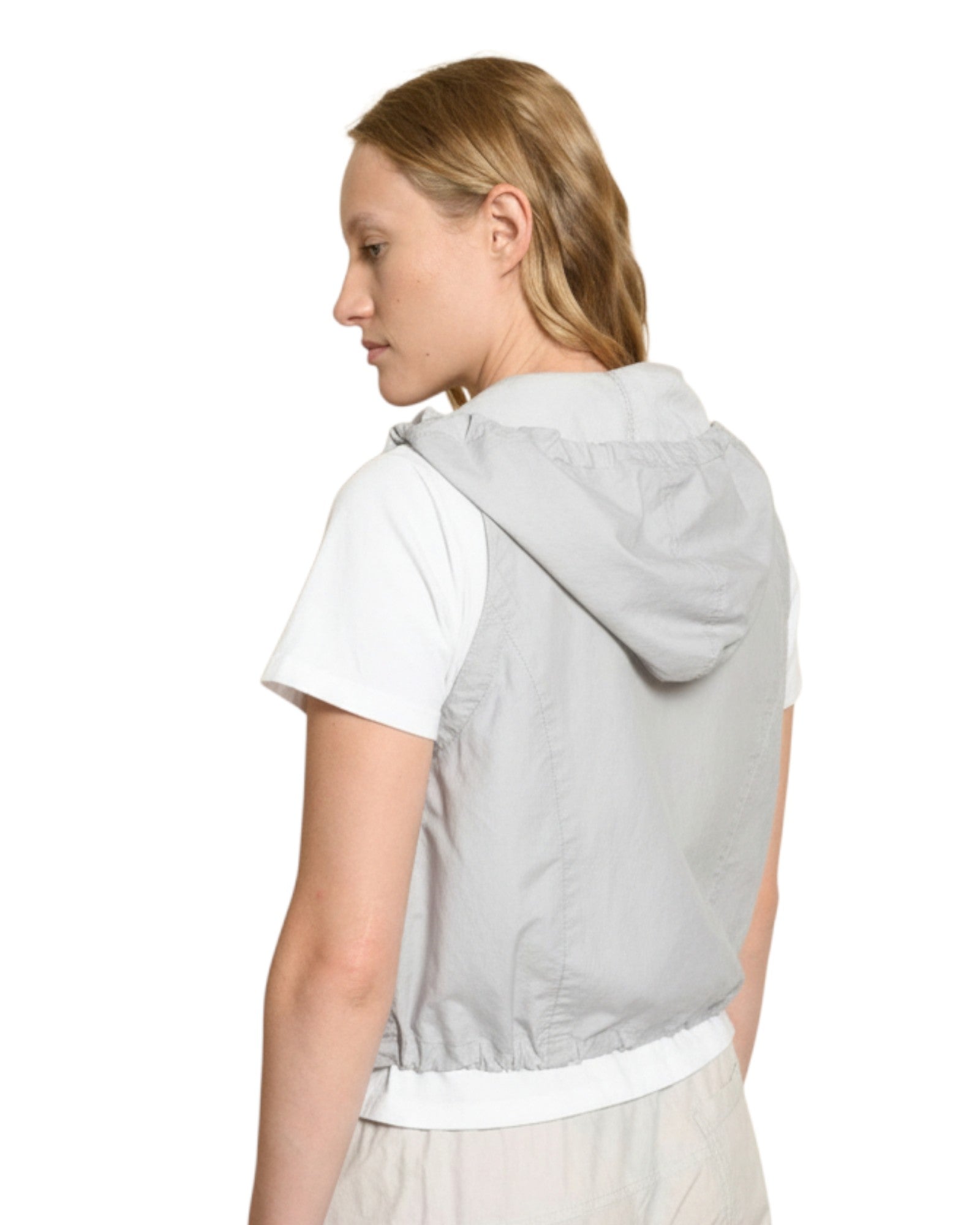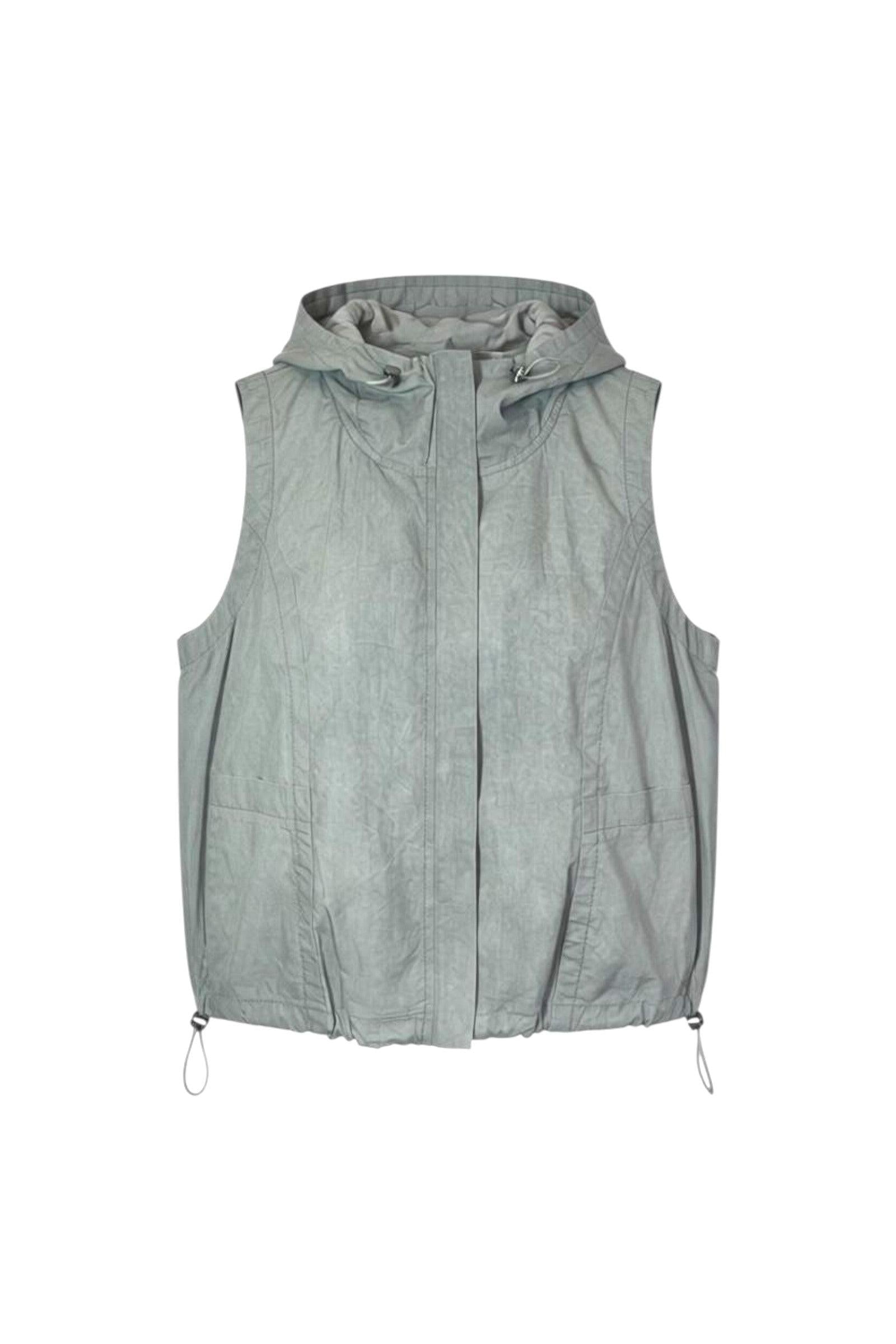 Weste CELIA aus der Kleidungs-Kollektion von AMBER & MOON. Kurze ärmellose Jacke mit Kapuze. Die Jacke hat ein elastisches Kordelzugband in der Kapuze und im Saum mit Metallstoppern.