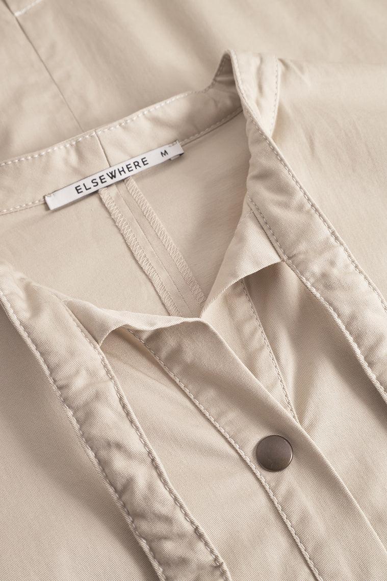 Kleid Summer aus der Bekleidungskollektion von ELSEWHERE Fashion. Gerades Modell Kleid mit 3/4-Ärmeln mit Umschlag und einem runden Ausschnitt mit Druckknopfverschluss. Das Kleid hat aufgesetzte breite Bänder. Die Nähte sind (kontrastierend) durchgesteppt.