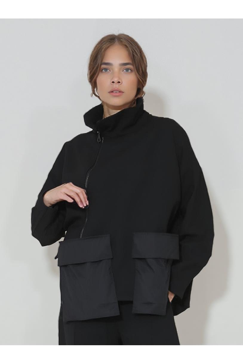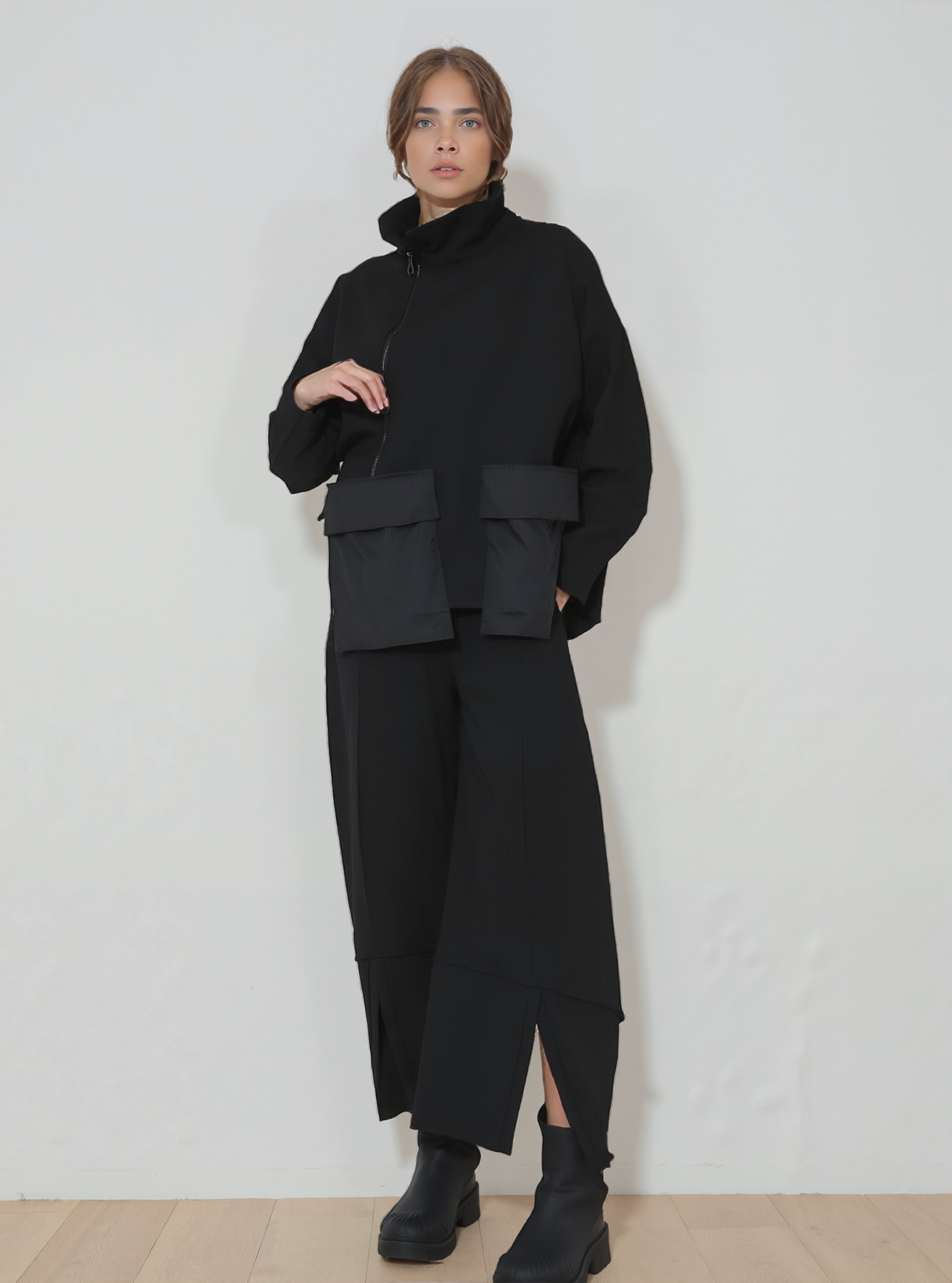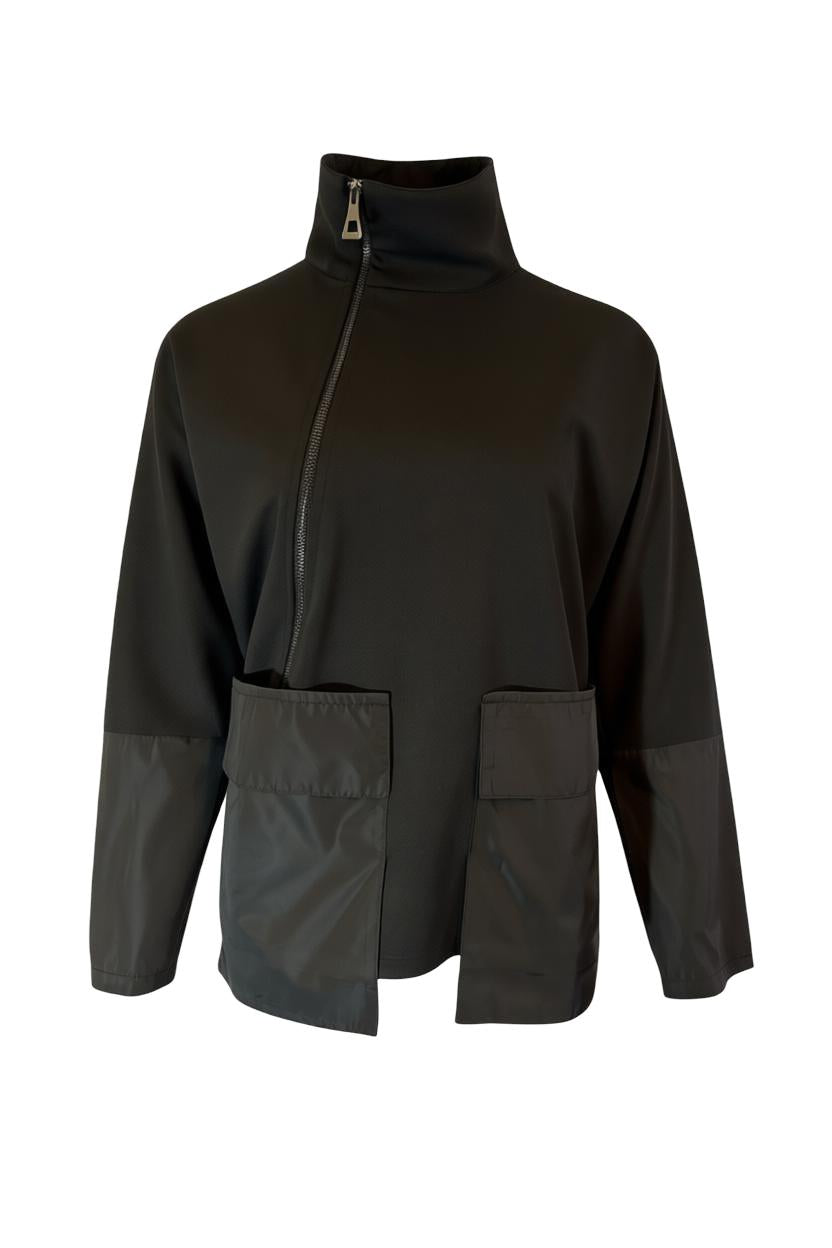 Jacke aus der Bekleidungskollektion von NILMARK. Strickjacke mit asymmetrischem Reißverschluss und stehendem Kragen. Die Taschen sind länger als das Vorderteil. Die Tasche, die über den Reißverschluss fällt, kann abgenommen werden.