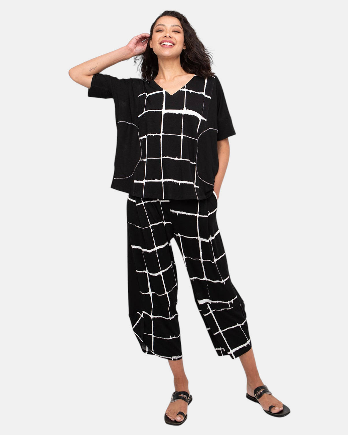 Gemaakt van viscose jersey met een abstract blok dessin in combinatie met effen zwarte jersey (zijpanden en mouwen)