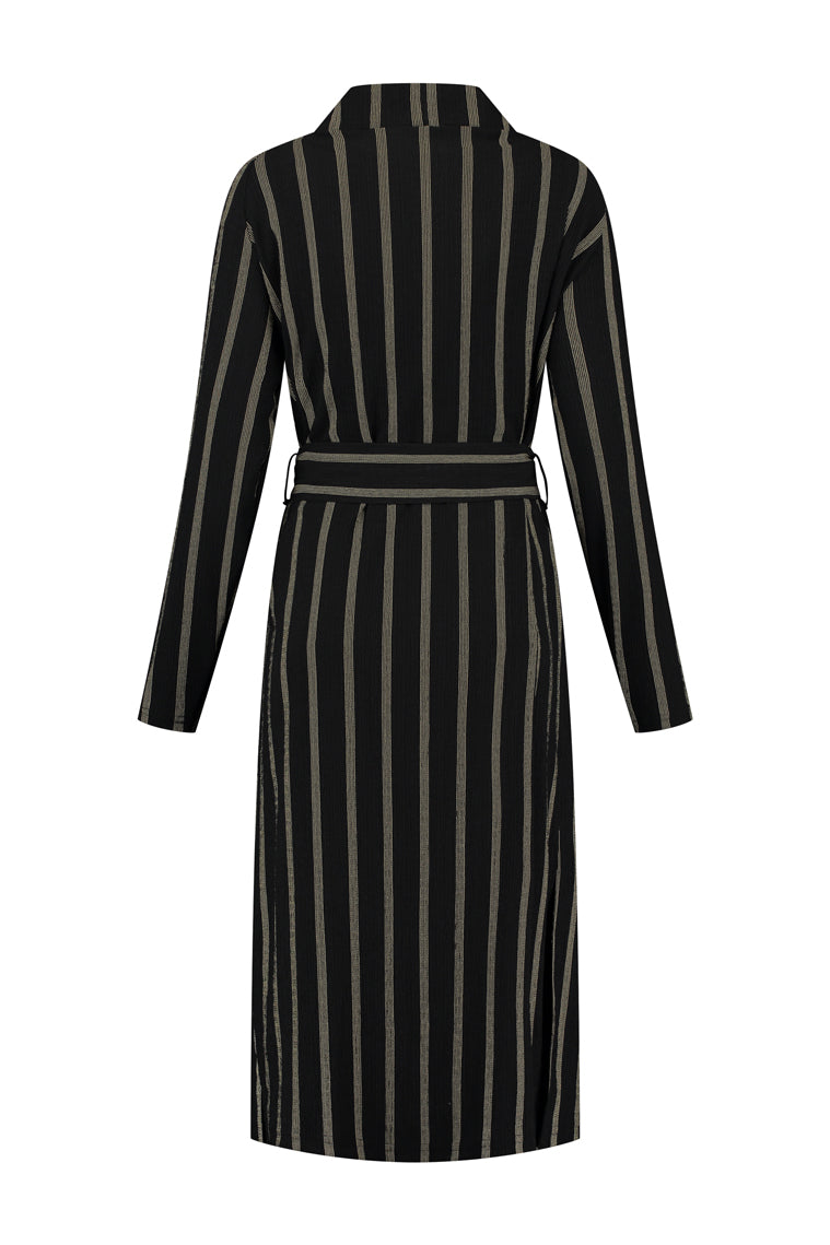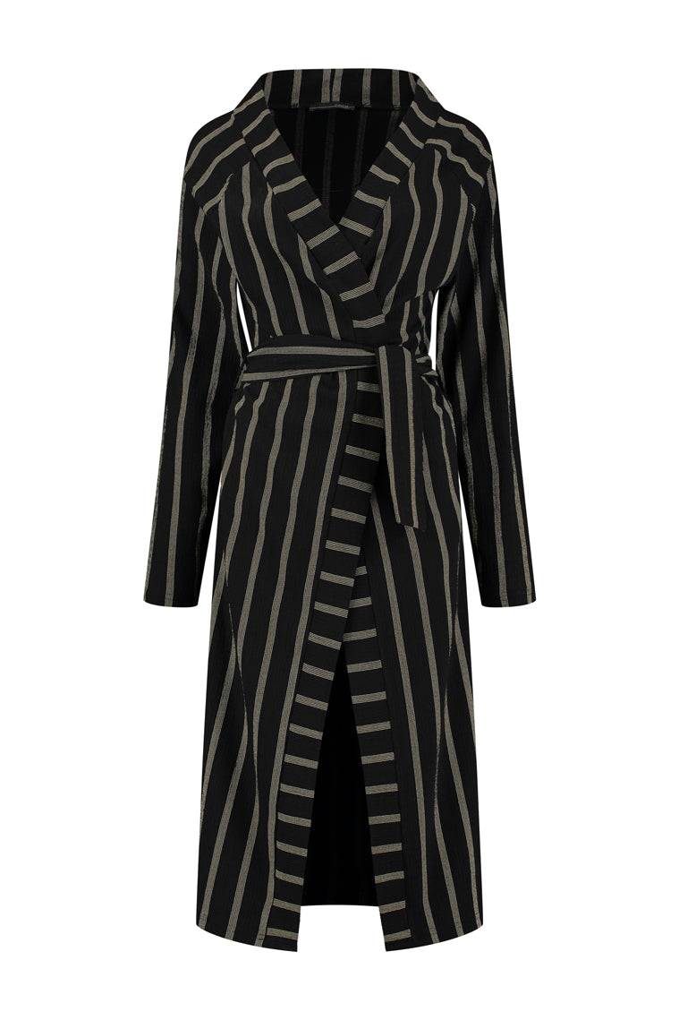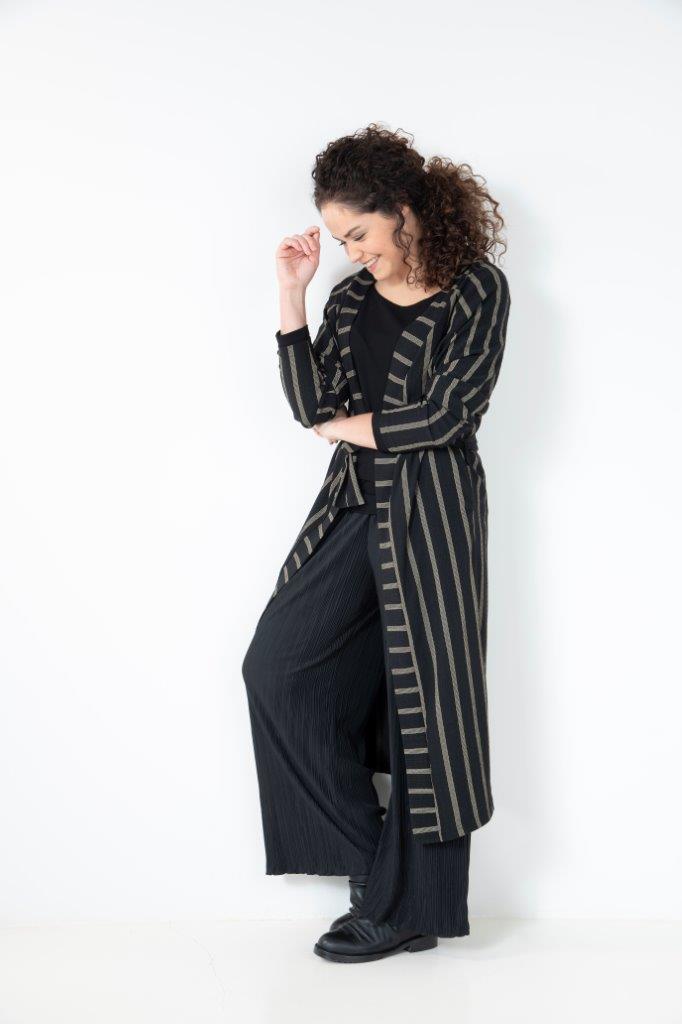 Lange Strickjacke von ELSEWHERE Fashion. Gerades Kimonomodell mit Bindegürtel in der Taille. Der Cardigan ist mit einem breiten Besatz mit einem Streifen in die entgegengesetzte Richtung getrimmt. Aus geschmeidigem schwarzem Jersey mit eingewebtem Meersalz-Farbstreifen.